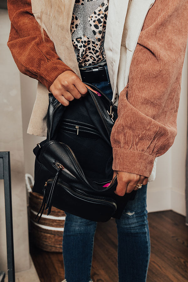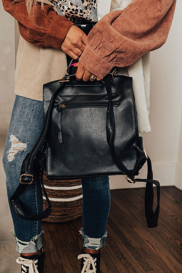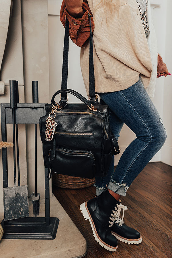 There is no better everyday bag than our trendy black 'Pay It Forward' backpack featuring faux leather material, two zip closure pockets on the front and a zip closure pocket in the back, two adjustable shoulder straps, a single handle, and a spacious fully lined zip closure pouch with an additional zip pocket closure inside! Plus, this cutie comes with a leopard print hand sanitizer keychain!