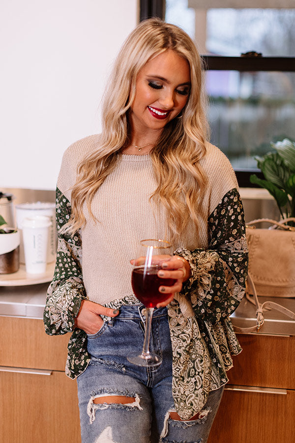 You will feel nothing but peace and joy when you wear this charming birch colored shift top featuring lightweight material with ribbed texturing, unique floral print accents, a high rounded neckline, long bubble sleeves with flared cuffs, and a relaxed silhouette that falls into a peplum bottom with an uneven hemline!