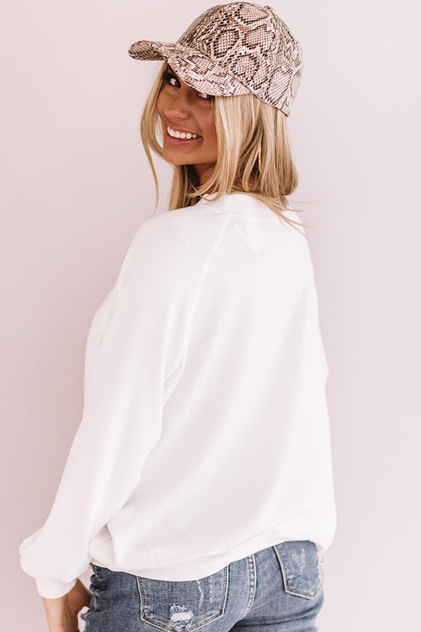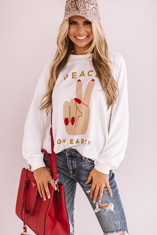 Stay comfy and cute in our white "Peace On Earth Sweatshirt" featuring soft lightweight material, a high rounded neckline, long loose sleeves with fitted cuffs, an adorable front graphic, and a relaxed silhouette that falls into a straight hemline! You can style this piece up with some distressed ankle skinnies, a snake print baseball cap, a red tote, and bronze booties, or you can dress it down by wearing it with "The Bombshell Joggers" and "The Delaney Sneaker in Gold!" Measurements