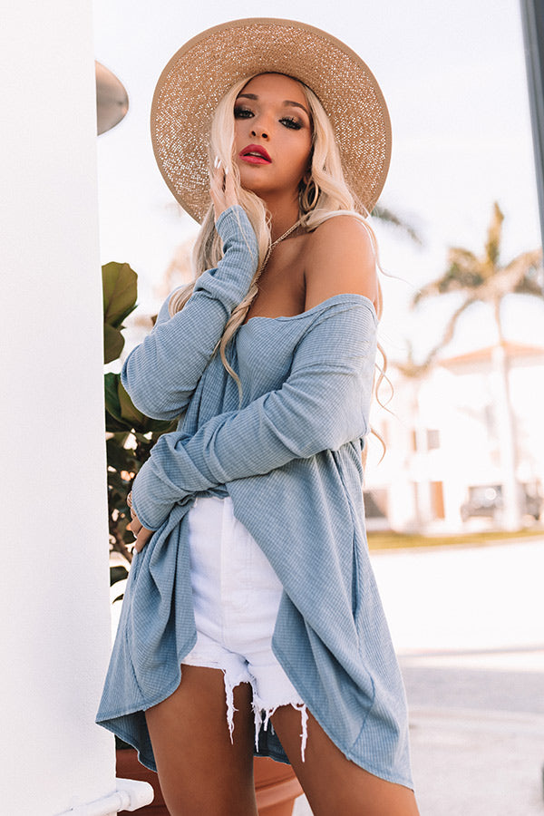 Spend a peaceful weekend in style with our adorable airy blue top featuring soft lightweight material with a center exposed accent seam, a scooped neckline with an accent v-notch, long loose sleeves, and an ultra slouched silhouette that falls into an uneven tunic-length hemline! Measurements