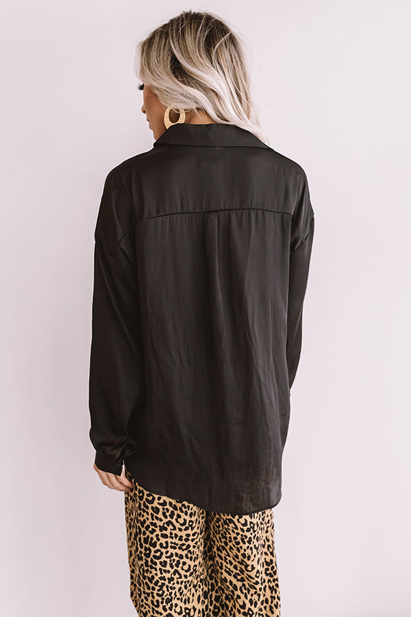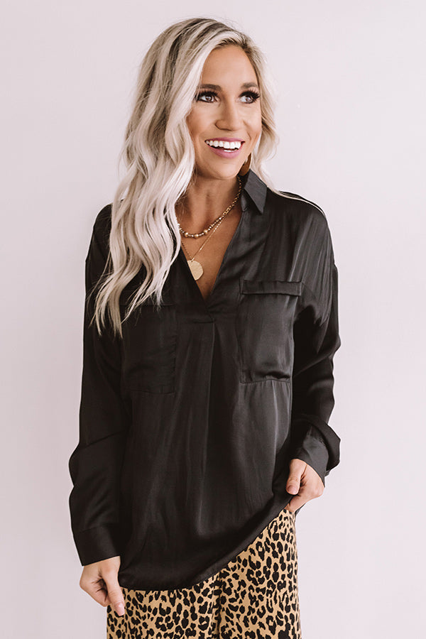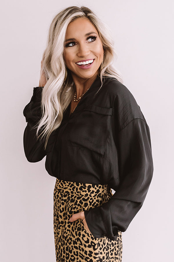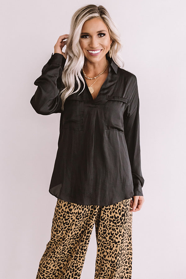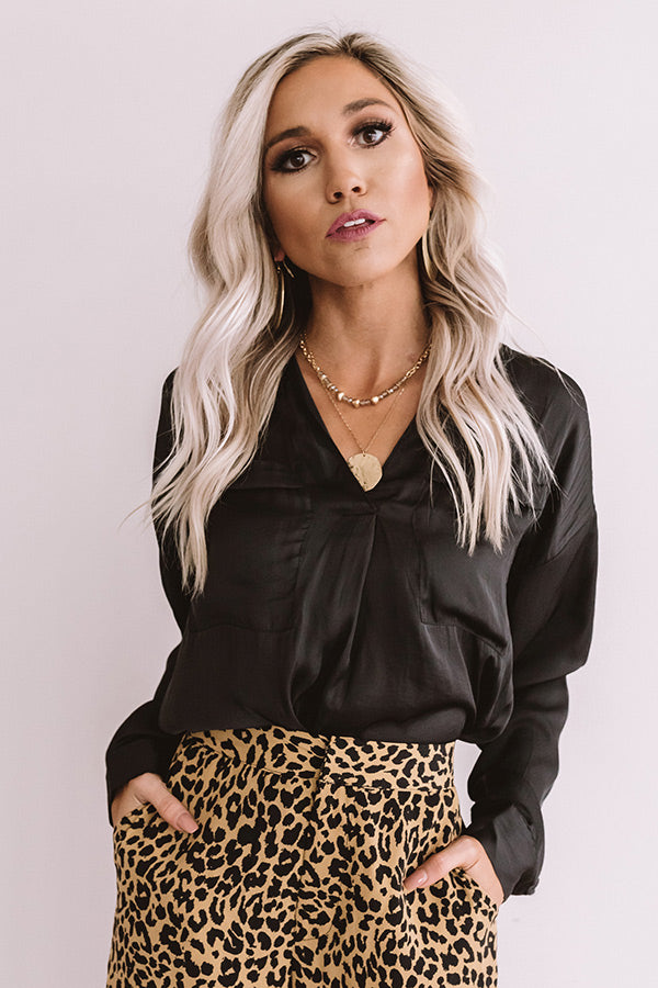 Looking for a fall piece that you can wear from nine to wine? Then our little black "Pearls And Perfume" shift top is perfect for you with its lightweight satin material, collared v-cut neckline, long loose bishop sleeves with fitted button closure cuffs, two accent chest pockets, and a relaxed silhouette that falls into a rounded hemline! We have styled this simple but significant piece with some leopard flares, but you can also wear it with some distressed ankle skinnies, "The Emmaline Bootie in Black," and a snake print tote and headband!
