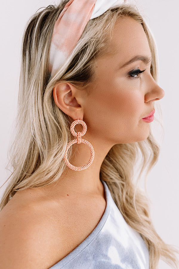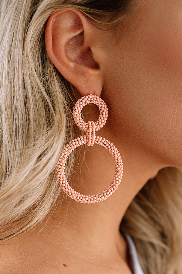 These adorable statement earrings are perfect for a beach party with their peach colored beaded hoop studs and larger dangling beaded hoops!