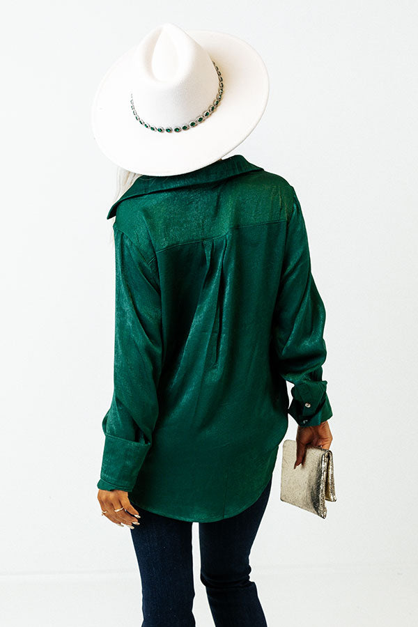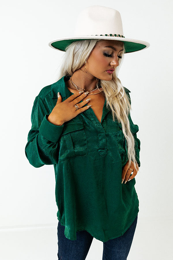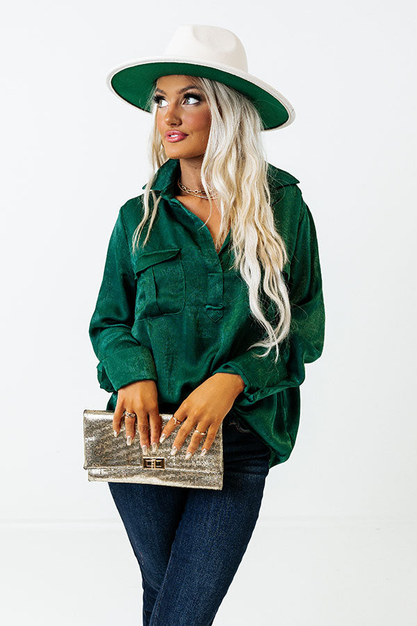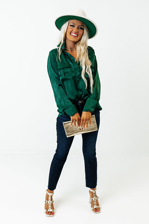 Happiness is old friends, new places, and hot cider! Make new memories in our 'Penn Station Meetup' satin top featuring lightweight hunter green material, collared v-neckline, two functional chest pockets with flap closure, long loose sleeves with cuffs and button closure, and a relaxed silhouette that falls into a rounded hemline.