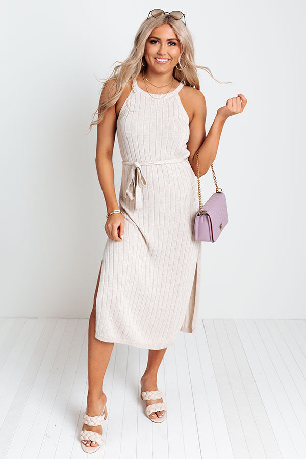 You won't find a more casual everyday dress than our chic birch hued 'Penn Station' midi dress featuring soft lightweight tight knit material with vertical ribbed texturing, a rounded neckline with sleeveless shoulder straps, a tie belt, and a flattering figure hugging silhouette that ends in a straight mid-calf length hemline with high accent side slits!