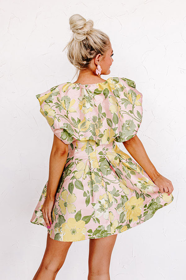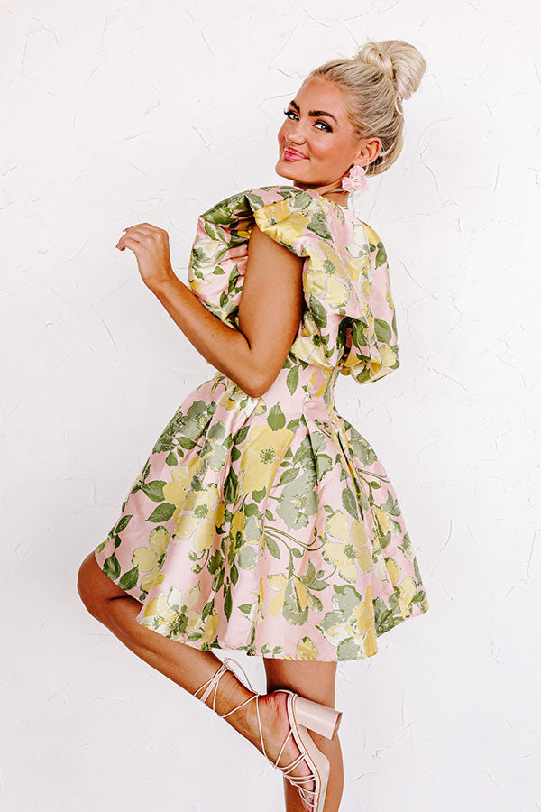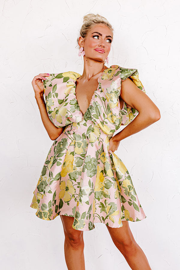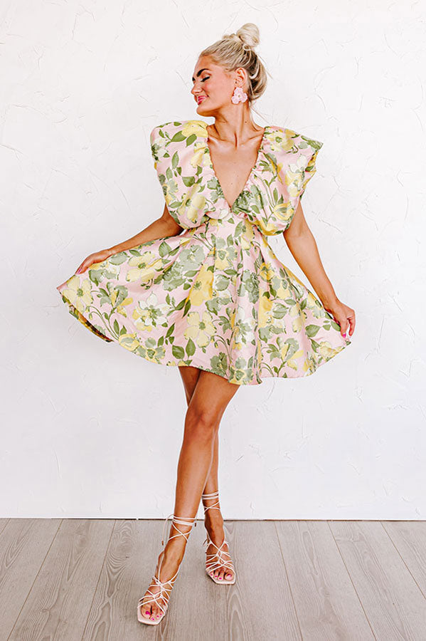 - It's tea party time in this gorgeous dress! - Fully lined material with a yellow and green hued floral design - A deep-v neckline with gathered detail - Puff sleeves - A pleated skirt - Side zip closure - A figure flattering silhouette that ends in a mid-thigh length hemline