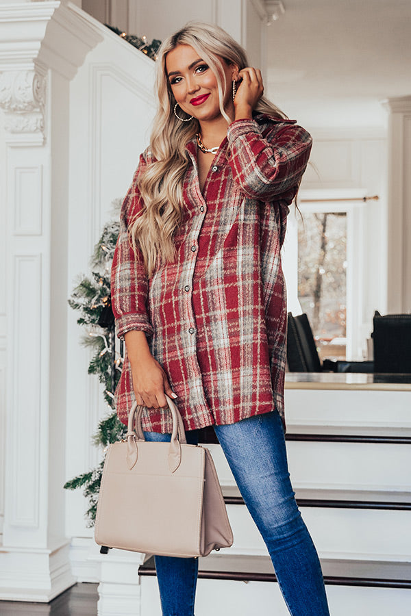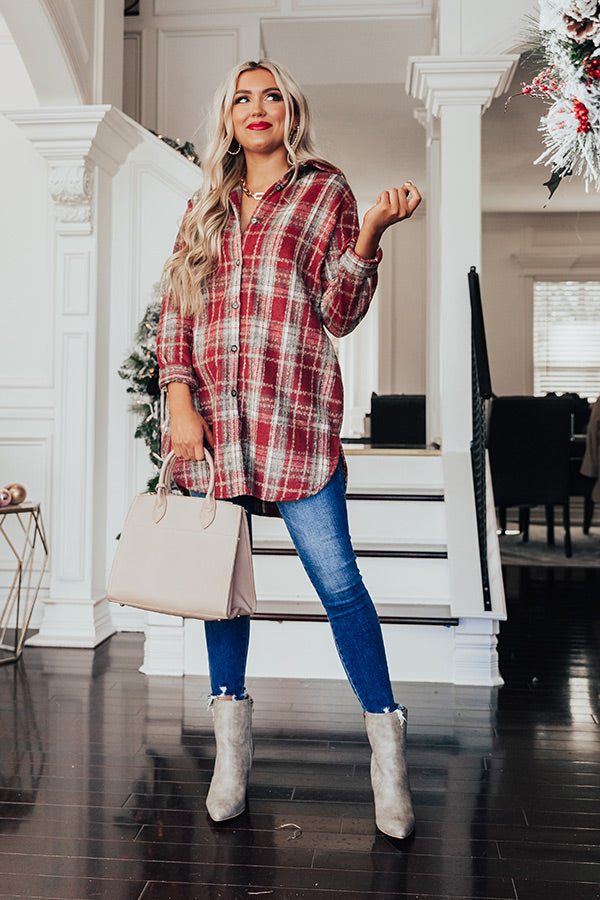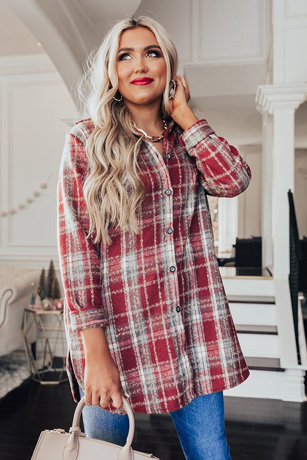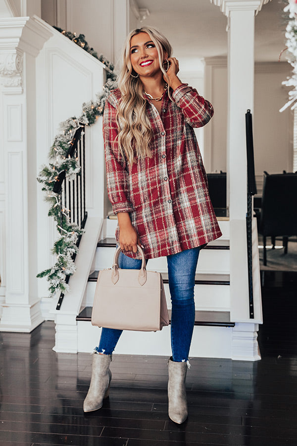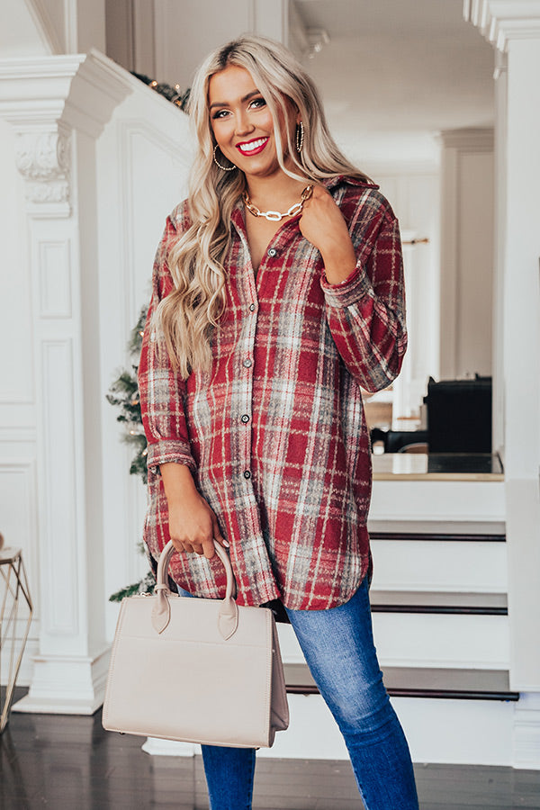 Channel all the Christmas vibes with our stunning 'Peppermint Kisses' flannel dress featuring lightweight material patterned with a bold aurora red colored plaid print, a button down front with a collared neckline, long loose sleeves with fitted button closure cuffs, low accent pockets, and a slouched silhouette that falls into a rounded mid-thigh length hemline! Measurements