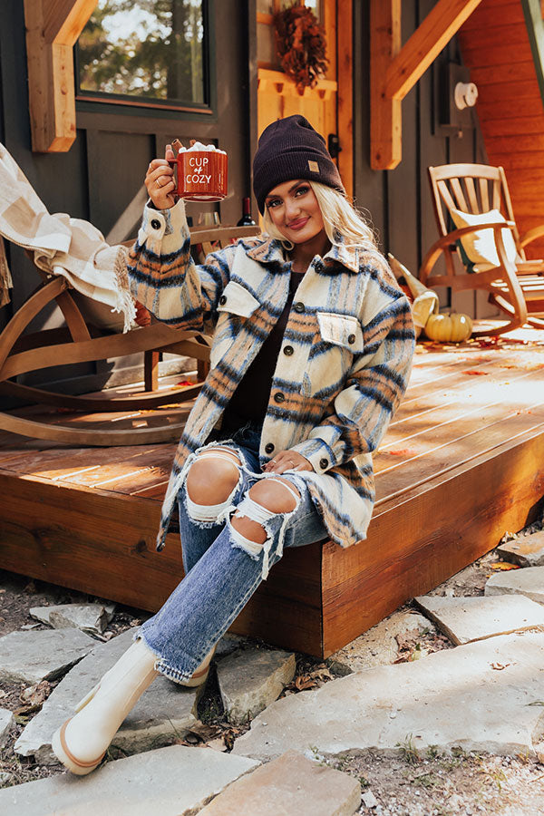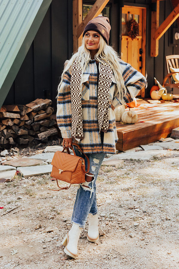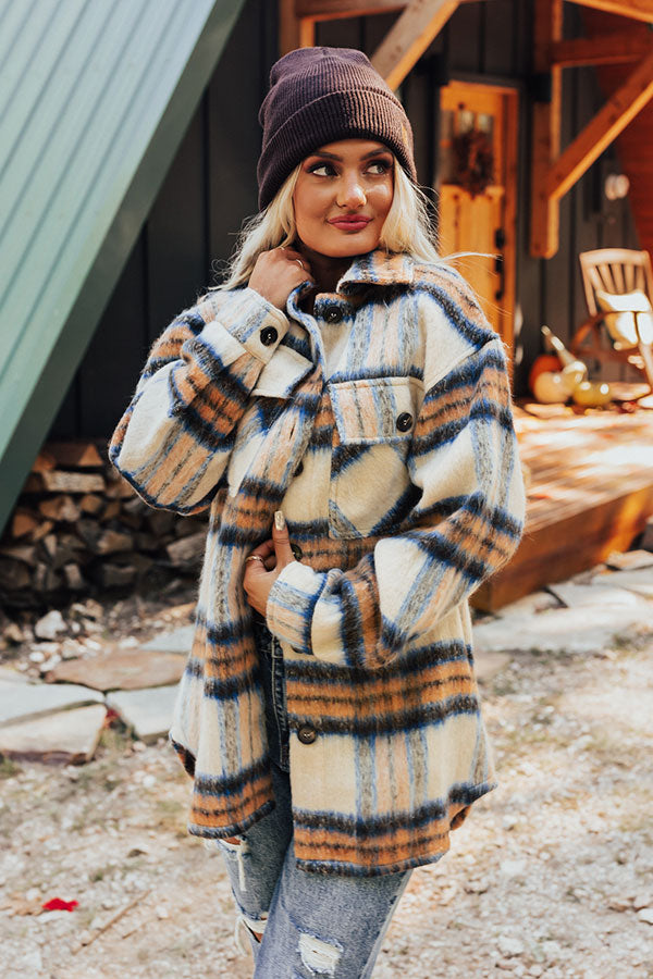 We guarantee you will have 'Perfect Days Ahead' with our jacket! Features a warm plaid material in orange, blue, cream and brown hued, buttoned up collared neckline, long sleeves with button closure on the cuffs and chest flap pockets, and a relaxed and flattering silhouette that falls into a round hemline.