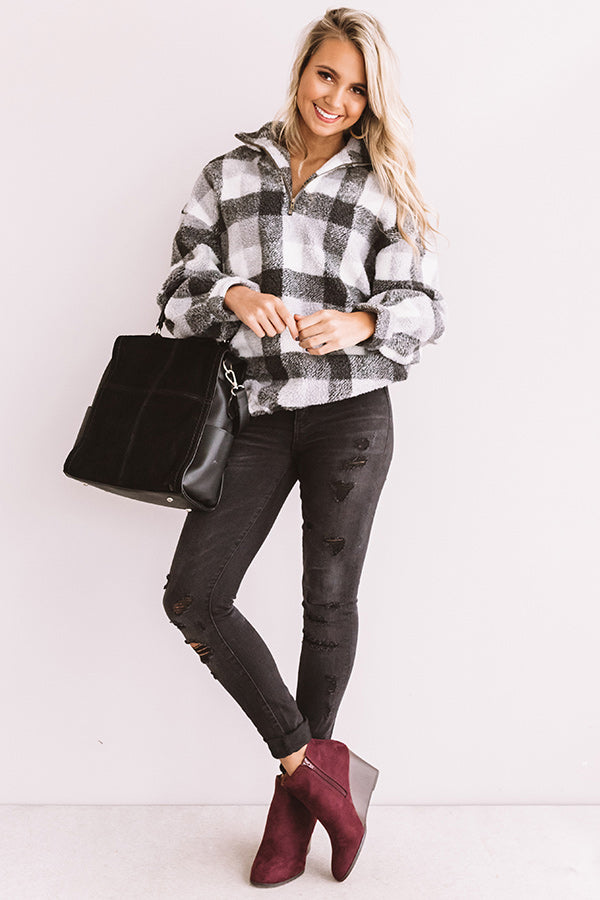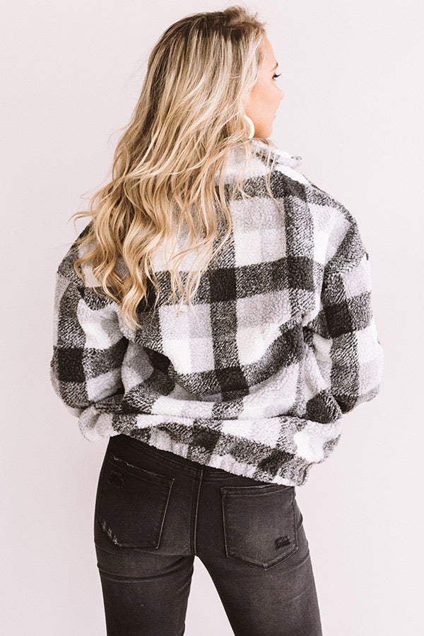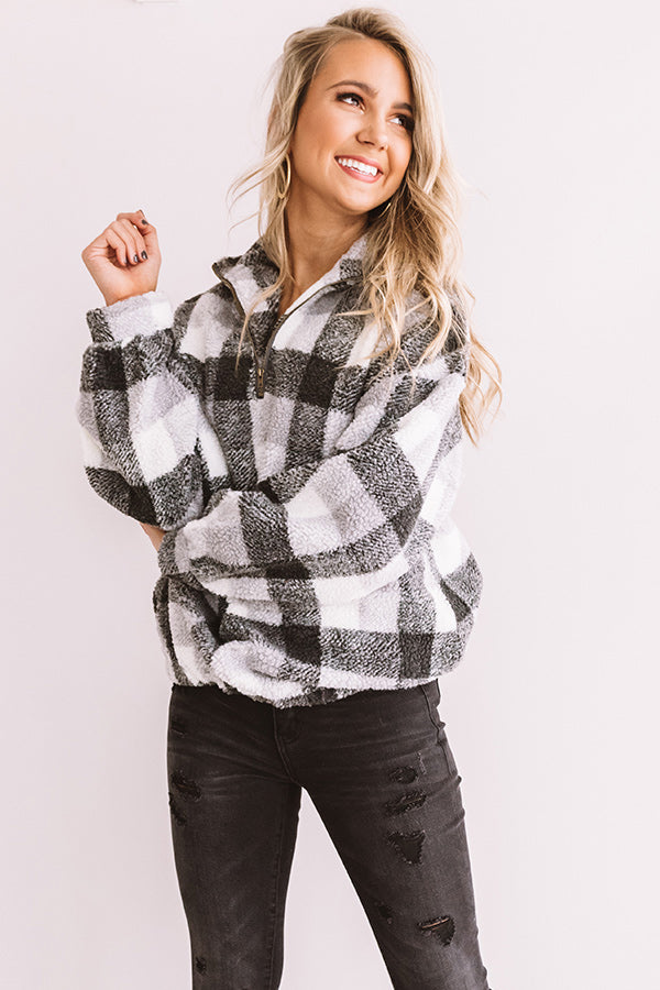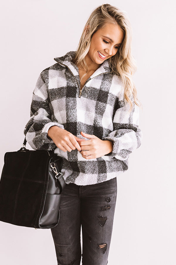 We have no doubt you will look "perfect n' plaid" when you wear this grey pullover featuring an ultra soft sherpa material with a black and white checked pattern a zip up bodice with a high collared neckline, long oversized sleeves with fitted cuffs, and a relaxed bomber style silhouette that falls into a straight elastic hemline! We have styled this piece with some distressed black skinnies, a backpack, and wine colored booties, but you can also wear it with our "Cardio Queen High Waist Legging," a beanie, and "The Adrian Sneaker in Grey!" Measurements