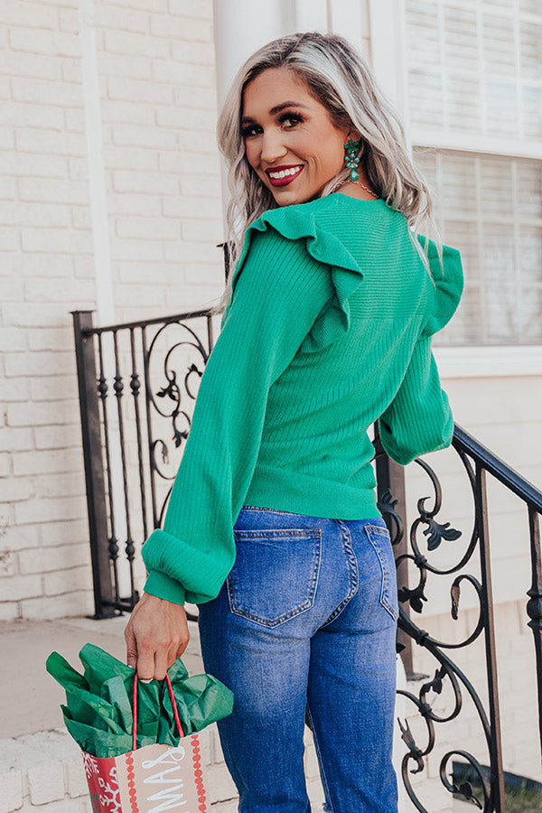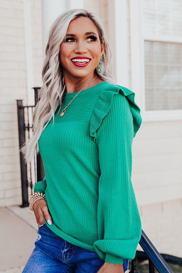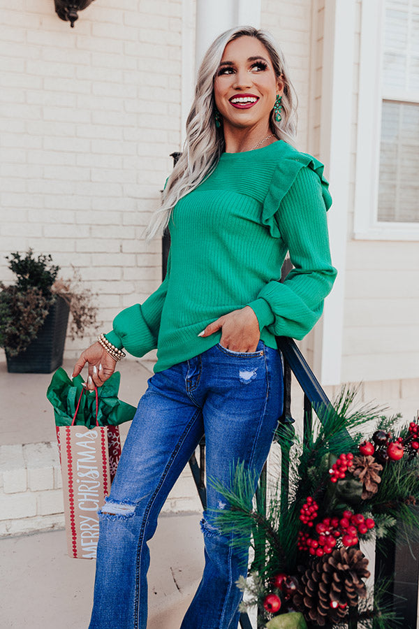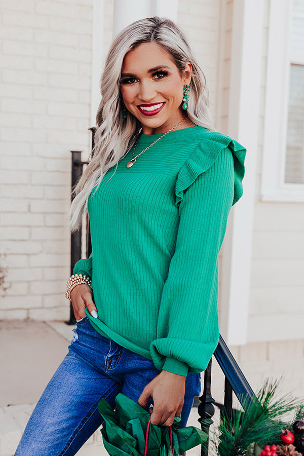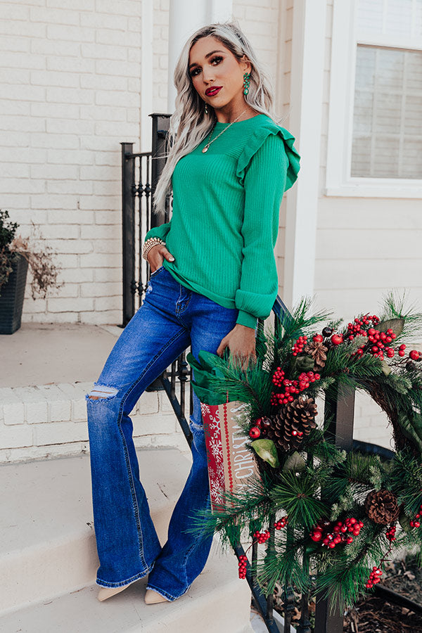 This casual cute emerald colored top is the perfect remedy for when you an effortless everyday look with its soft lightweight material, subtle ribbed texturing, high rounded neckline, long loose sleeves with fitted cuffs and ruffled shoulder detailing, and flattering silhouette that ends in a straight hemline! Measurements