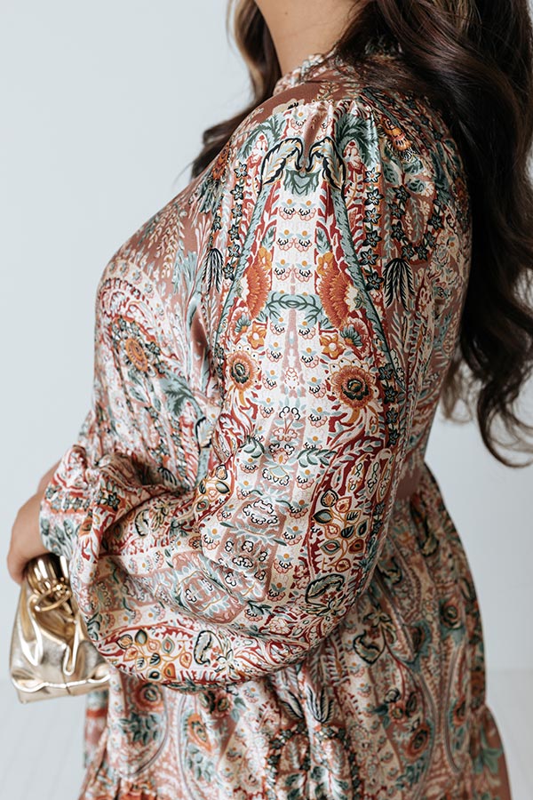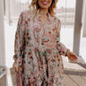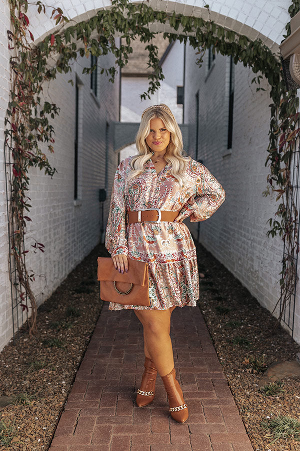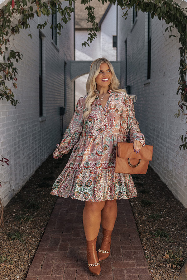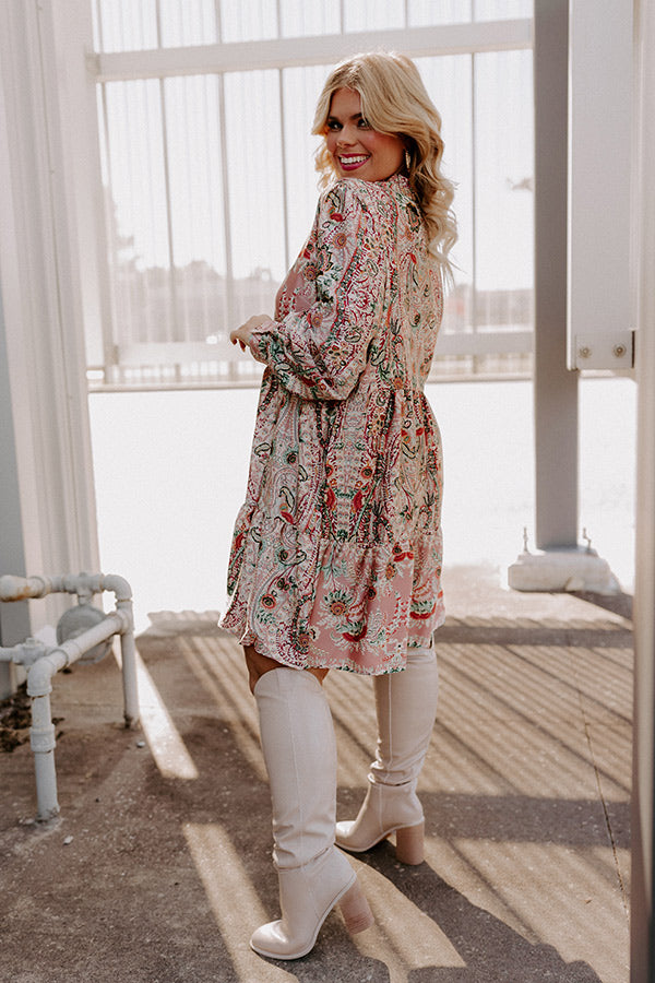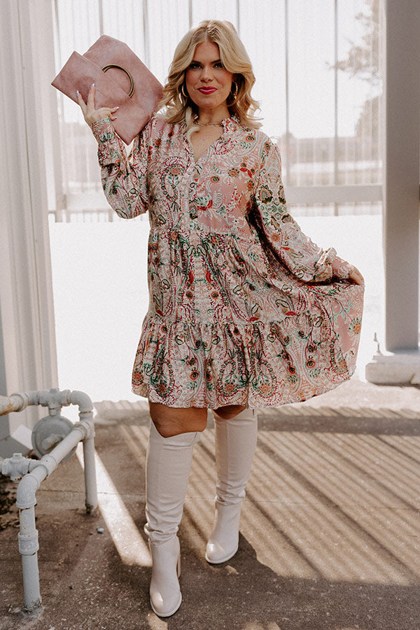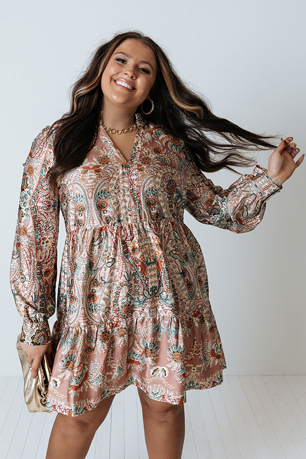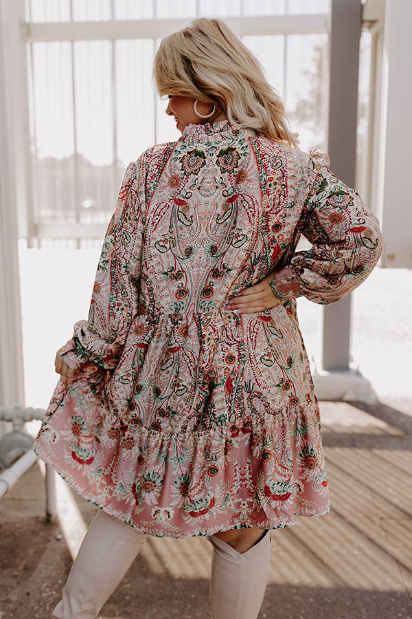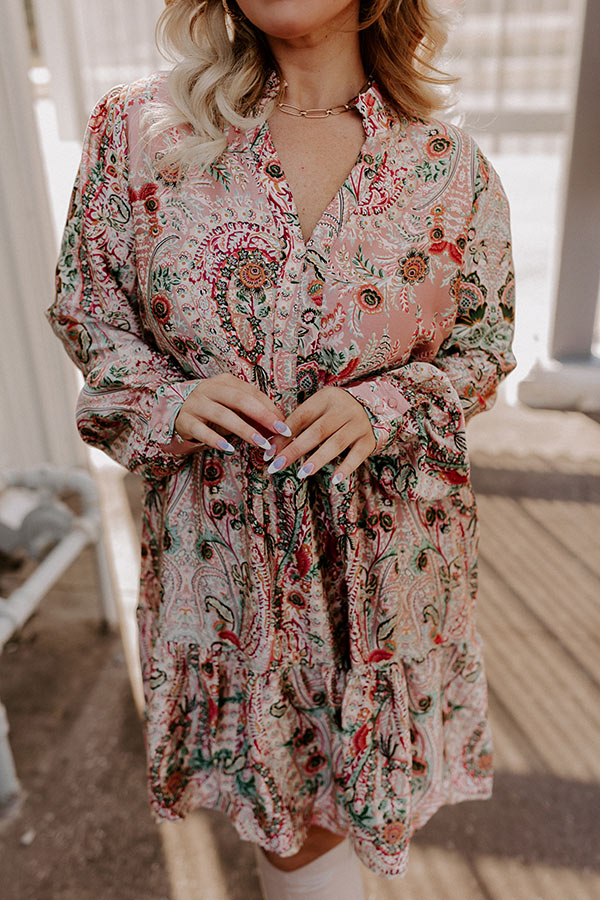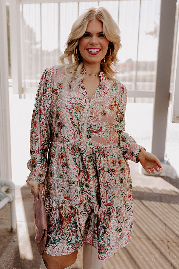 Believe us when we say this beautiful blush hued plus size shift dress is perfect for you with its sleek lightweight material, intricate teal, white, and coral hued floral print, a v-cut neckline with a ruffled collar, long loose sleeves with button closure cuffs, and a relaxed silhouette that falls into a straight mid-thigh length hemline!