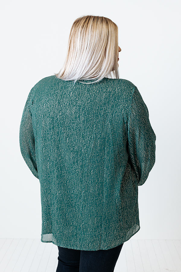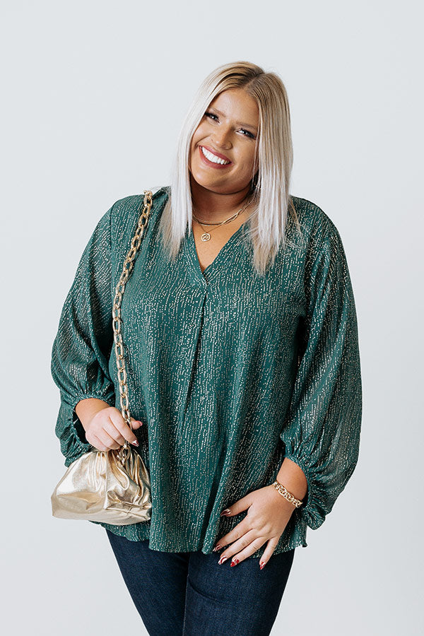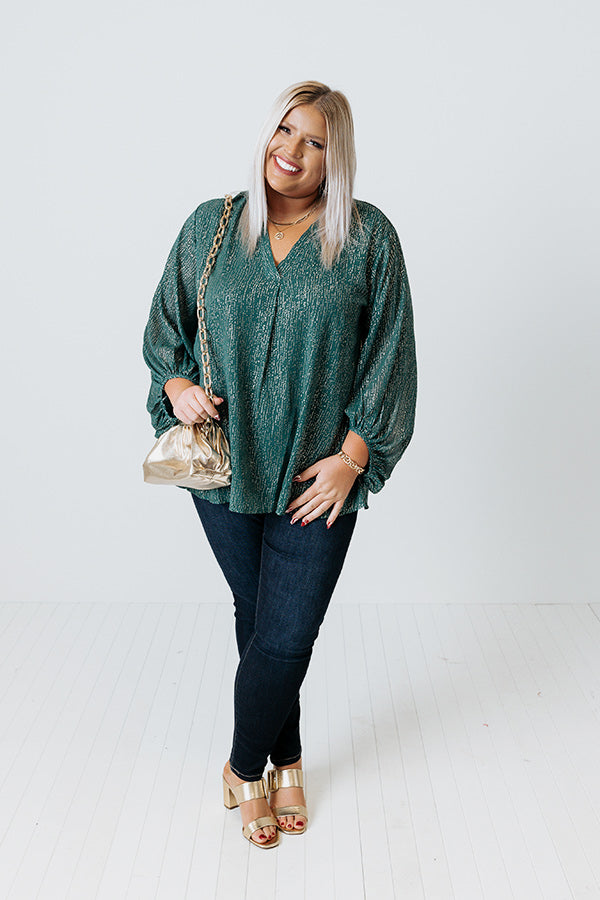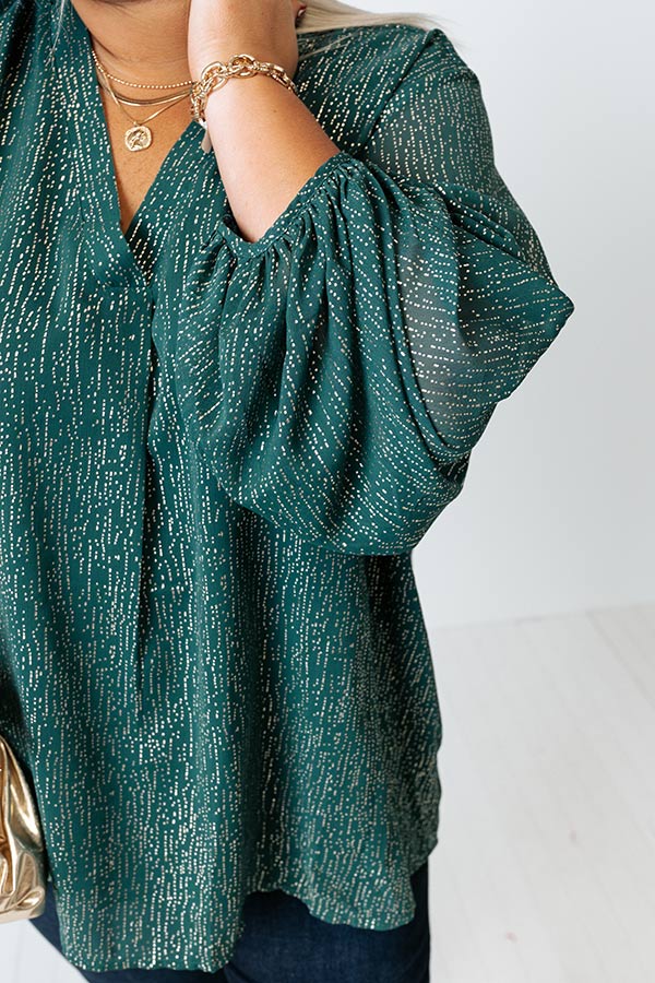 Shine bright in our elegant plus size hunter green 'Perpetual Motion Shift Top' featuring lightweight flowy material patterned with shimmering gold lines, a v-cut neckline, oversized 3/4-length sleeves, and a relaxed silhouette that falls into a straight hemline!
