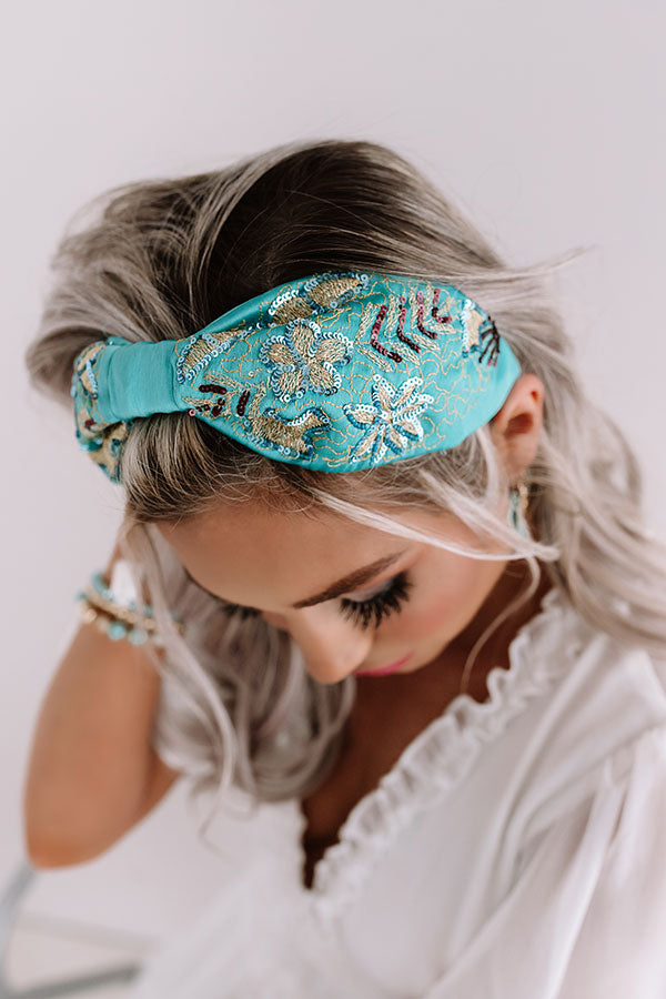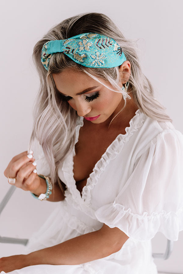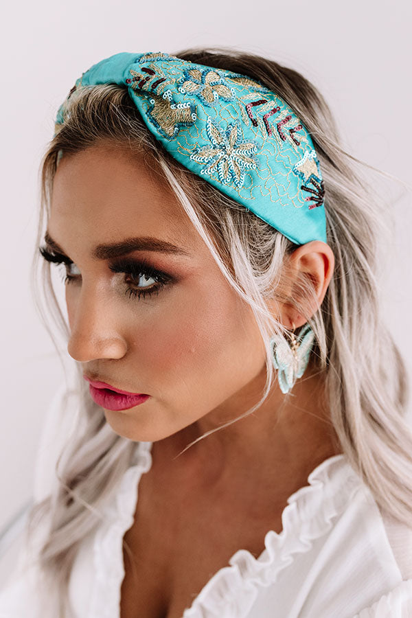 This adorable turquoise colored headband is photo worthy with its wide satin band featuring intricate embellished detailing and a wrapped center accent!