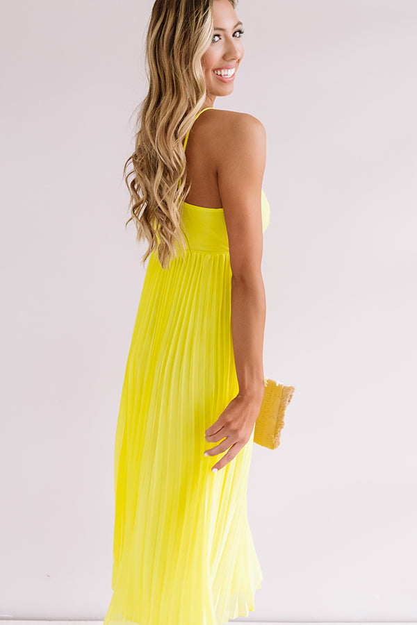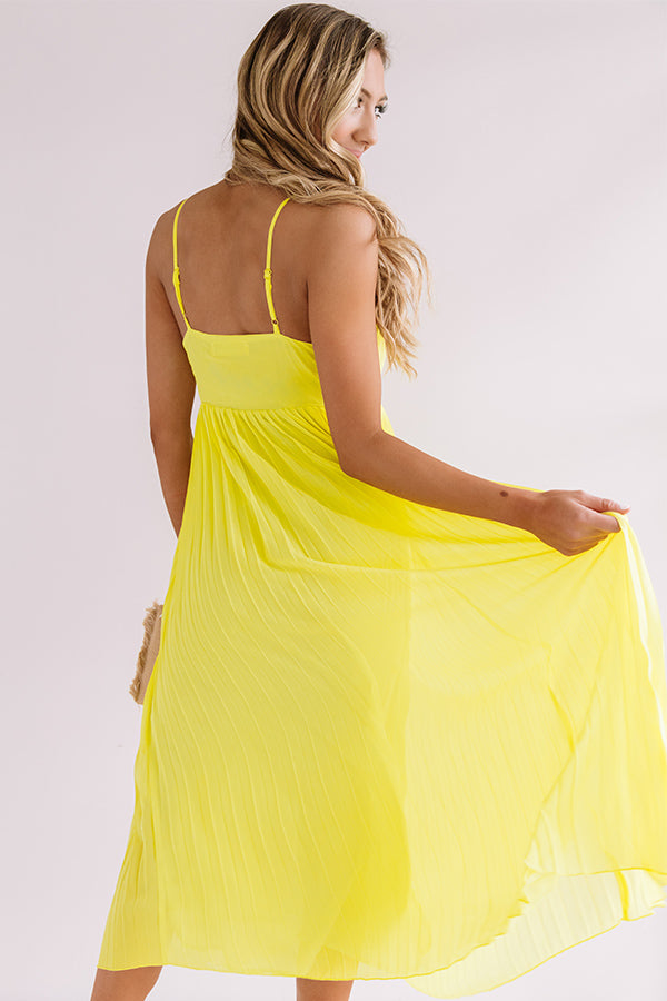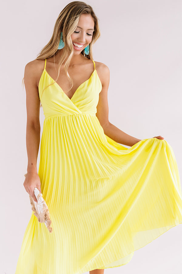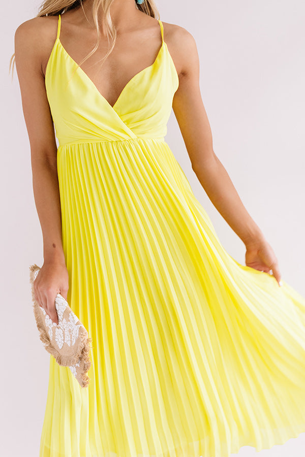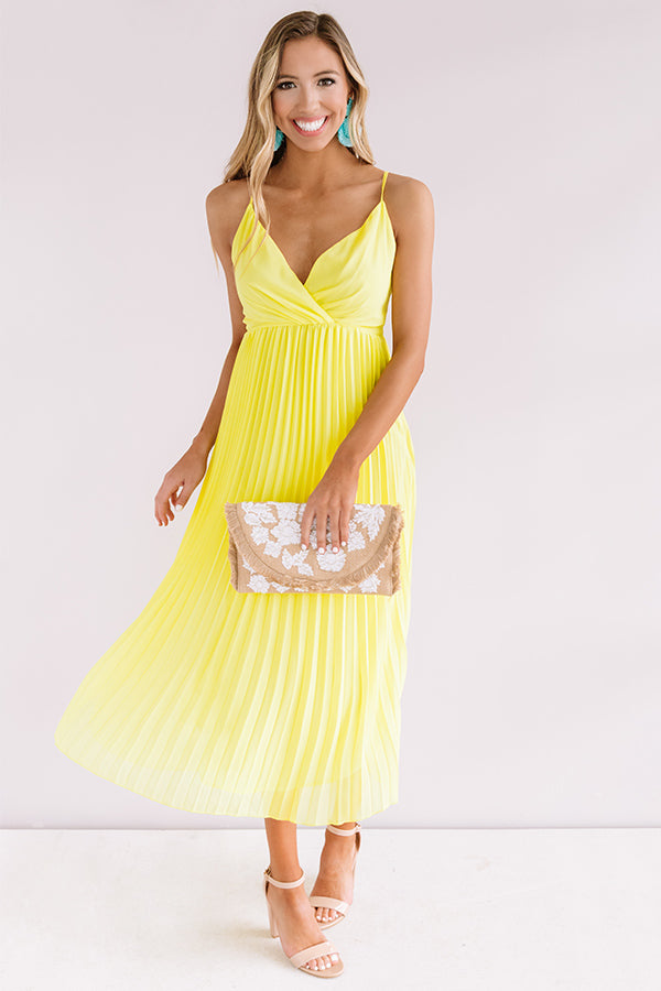 You won't be able to stop taking photos in this stunning neon yellow midi dress featuring lightweight breezy material with pleated detailing, a wrap bodice with a v-cut neckline, adjustable spaghetti straps with a low open back, and an ultra relaxed skirt silhouette that falls into an uneven mid-calf length hemline! This gorgeous piece styles perfectly with some neutral heels and an embellished clutch, but you can also wear it with "The Allen Wedge in Black" and our "Sweet Pearl Velvet Headband in Black!" Measurements