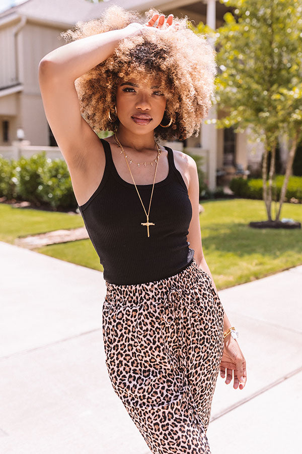 Hurry and add our flirty black "Pick Up The Pace Tank" to your cart with its lightweight material, subtle ribbed texturing, scooped neckline and upper back, 1-inch sleeveless shoulder straps, and form fitting silhouette that falls into a straight hemline! We have styled this cutie with some leopard joggers and black block heels, but you can also wear it with some distressed denim shorts, the "Green Day Leopard Slip On Sneaker," sunnies, and our "Leopard Lovely Leopard Crossbody!"