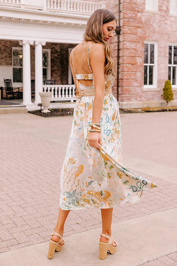 - Strike a pose in paradise in this trendy midi dress! - Lightweight, beige colored material with a colorful design - Full lining - Scoop neckline - Adjustable spaghetti straps - Back elastic feature and cut out detail - Flowy silhouette that ends in a straight midi length hemline
