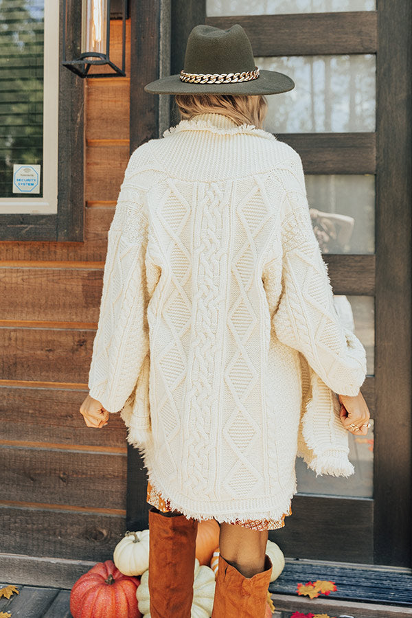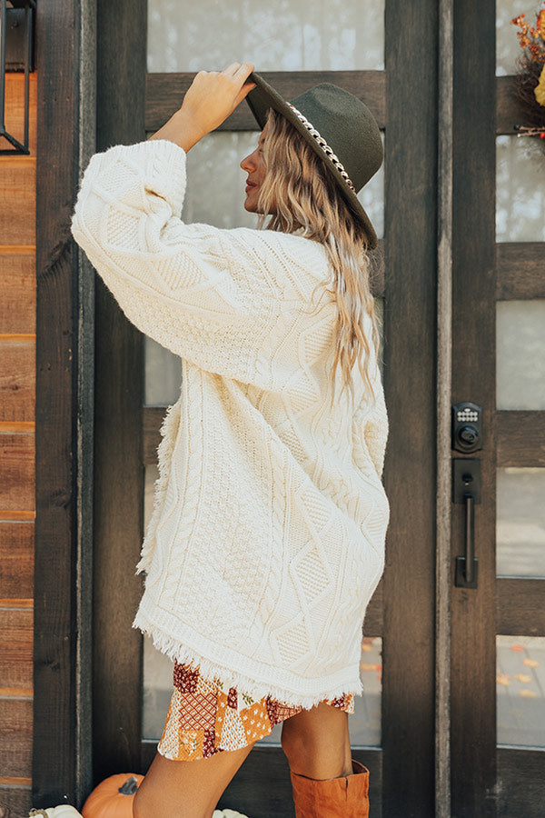 It will be a piece of pie to choose your outfit in the morning when you add this adorable ivory colored cardigan to your wardrobe! It features soft and thick knit material, frayed trim detailing, long loose sleeves, and a draped open front silhouette that falls into a straight mid-thigh length hemline!