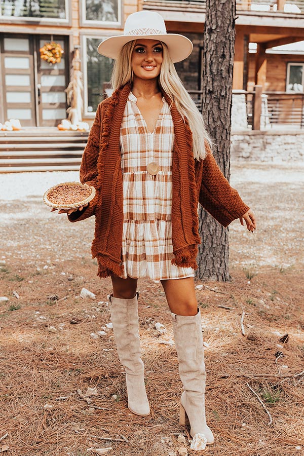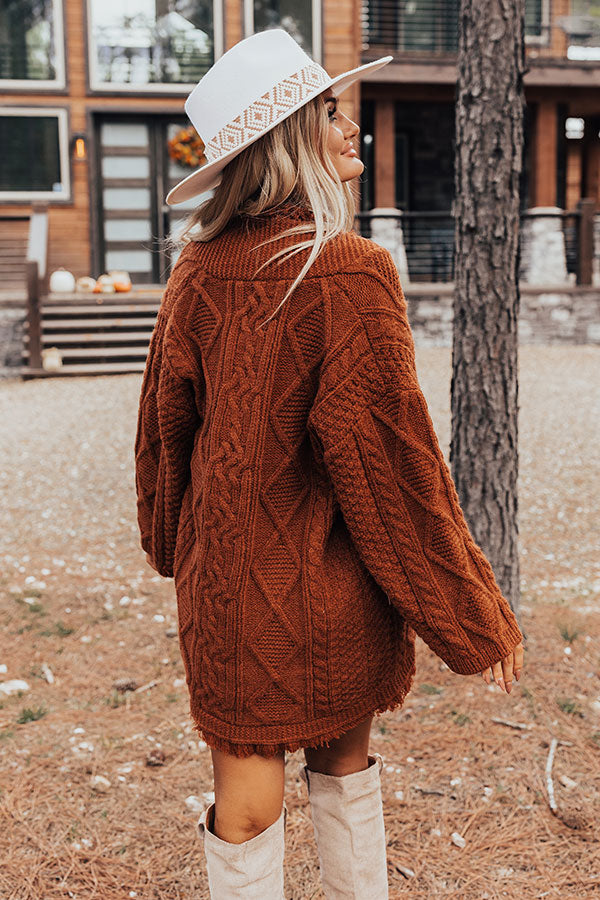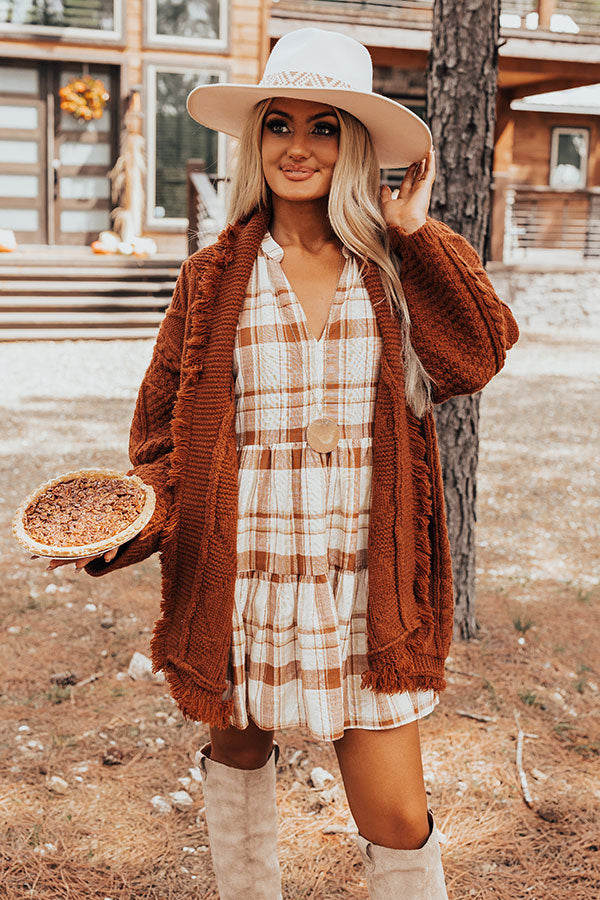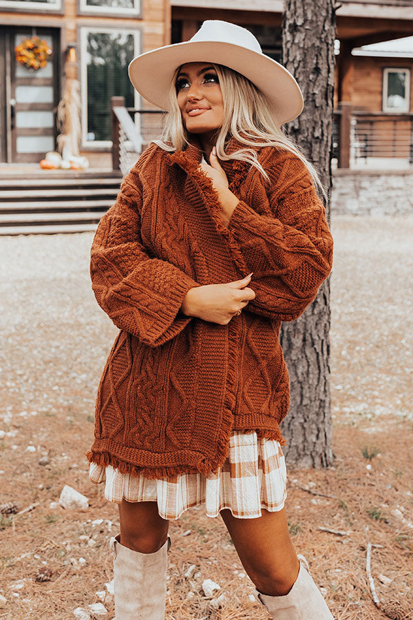 It will be a piece of pie to choose your outfit in the morning when you add this adorable rust colored cardigan to your wardrobe! It features soft and thick knit material, frayed trim detailing, long loose sleeves, and a draped open front silhouette that falls into a straight mid-thigh length hemline!