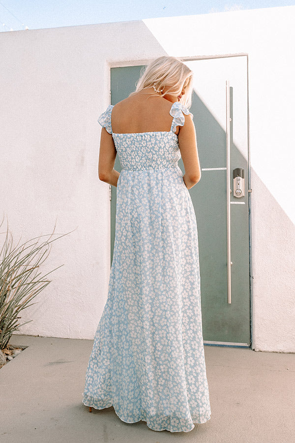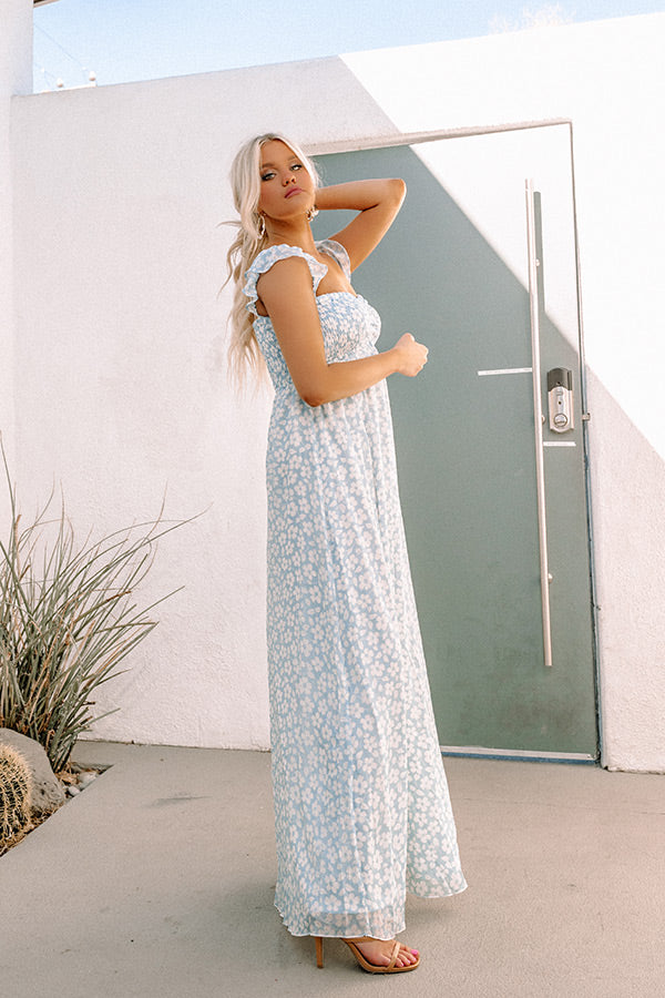 You will be dressed to impress in our charming light blue 'Pier And Dear Maxi' featuring lightweight material patterned with a white floral print, a sweetheart neckline with dainty ruffled cap sleeves, and a relaxed silhouette that cascades into a straight ankle-length hemline!