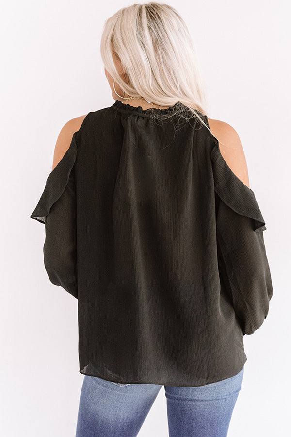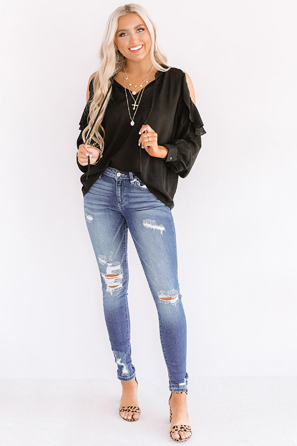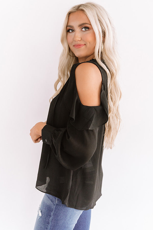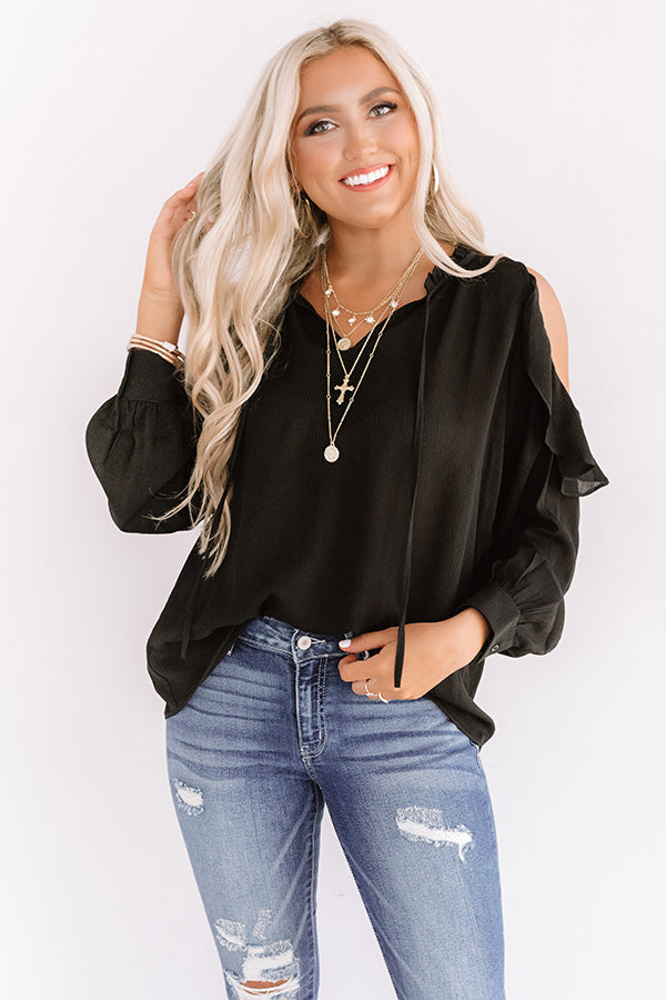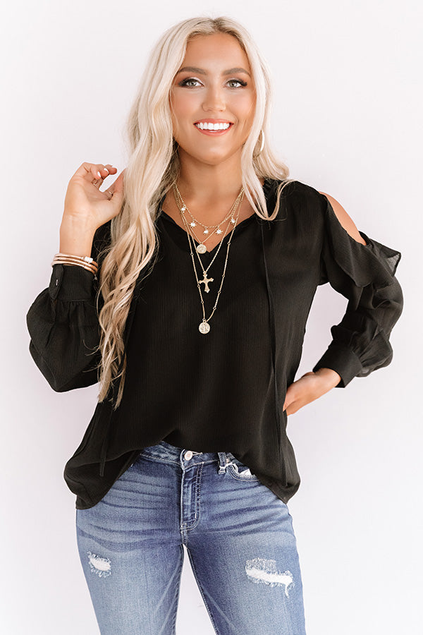 Look office chic or effortless everyday in our sophisticated black "Pier And There Shift Top" featuring lightweight breezy material, a v-cut neckline with a tie closure, long loose sleeves with fitted cuffs and cold shoulder cutouts, ruffled trim detailing, and a relaxed silhouette that falls into a straight hemline! We have styled this versatile piece with some distressed ankle skinnies and leopard heels, but you can also wear it with our "Office Goals High Waist Trousers in Taupe," sunnies, "The Lilianna Faux Suede Wedge in Black," and our "Steal Your Heart Faux Leather Tote in Warm Taupe!" Measurements