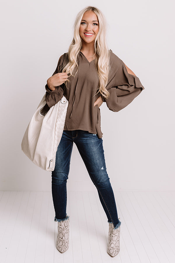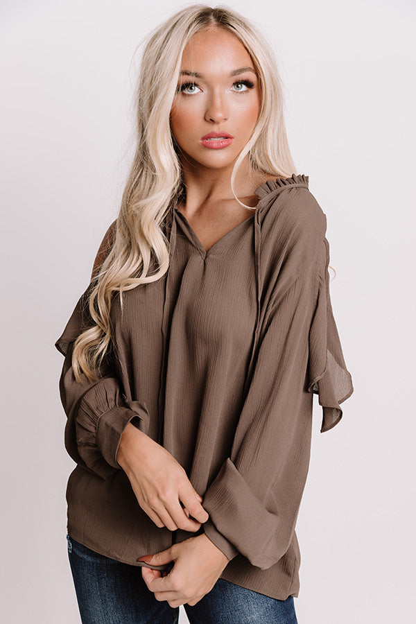 Look office chic or effortless everyday in our sophisticated espresso colored "Pier And There Shift Top" featuring lightweight breezy material, a v-cut neckline with a tie closure, long loose sleeves with fitted cuffs and cold shoulder cutouts, ruffled trim detailing, and a relaxed silhouette that falls into a straight hemline! Measurements