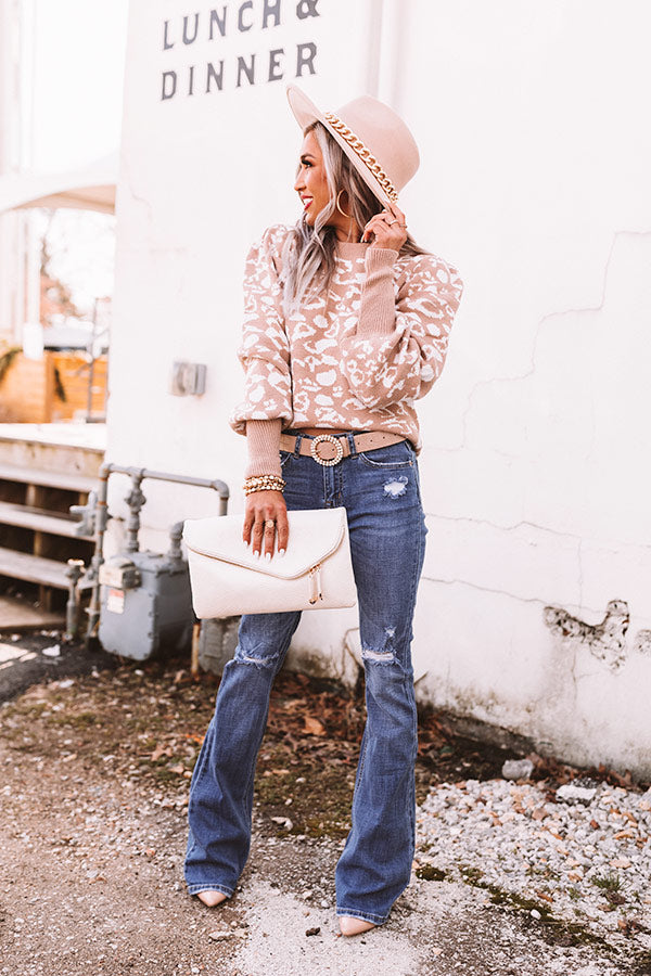Stay warm while also staying stylish in our adorable iced latte colored 'Pikes Peak' sweater featuring ultra soft lightweight tight knit material patterned with a large white leopard print, a high rounded neckline, ribbed trim detailing, long loose sleeves with puff shoulders and fitted forearm cuffs, and a figure flattering silhouette that falls into a straight hemline! Measurements
