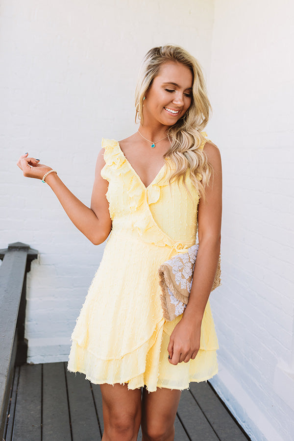 There is no better piece to enjoy "Pina Coladas in Punta Cana" in than this flirty light yellow dress featuring lightweight breezy material, a wrapped silhouette with a side tie closure, a v-cut neckline and upper back with ruffled trim detailing, wide 2-inch sleeveless shoulder straps, and a layered skirt that falls into an uneven mid-thigh length hemline! This pretty pastel piece styles perfectly with a neutral heel and embellished clutch, or you can wear it with our "Five Star Jute Wedge" and our "Pool Party In Panama Woven Hat!" Measurements
