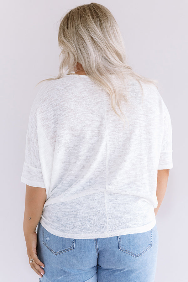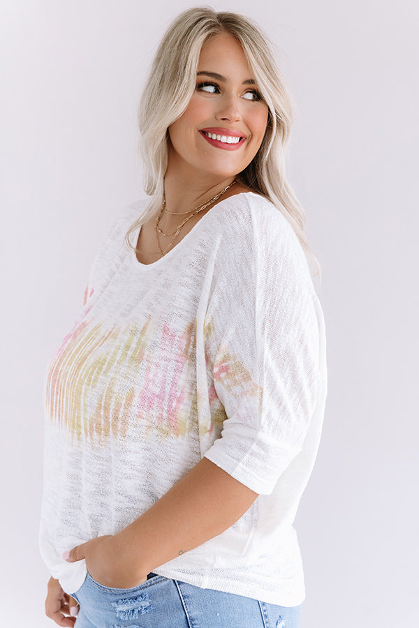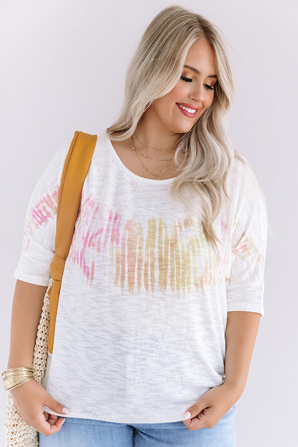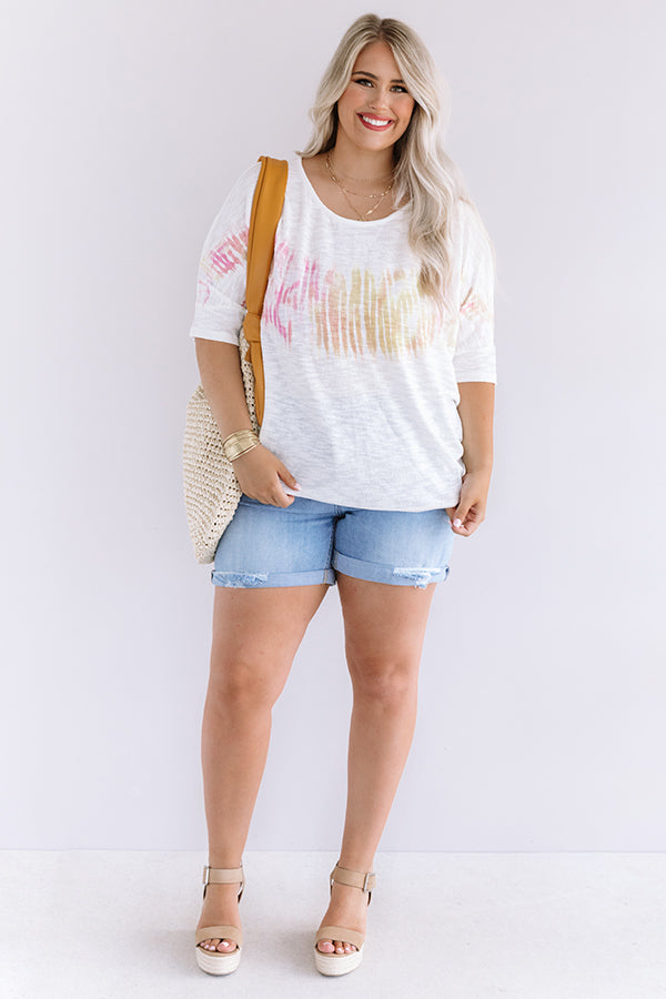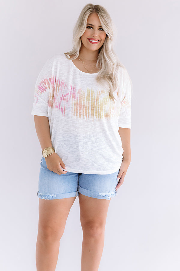 Plus Size - Relax in paradise with this adorable ivory colored top featuring soft lightweight tight knit material patterned with an abstract yellow and pink hued tie dye band across the front, a wide neckline that can be worn to one side, loose half sleeves, and a relaxed silhouette that falls into a rounded hemline! We have styled this casual cutie with some light wash shorts, neutral wedges, and a matching woven tote, but you can also wear it with some pink joggers, "The Lyla Sandal in Gold," and our gold "Spread Your Wings Butterfly Hair Clip Set!"