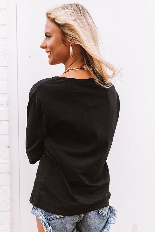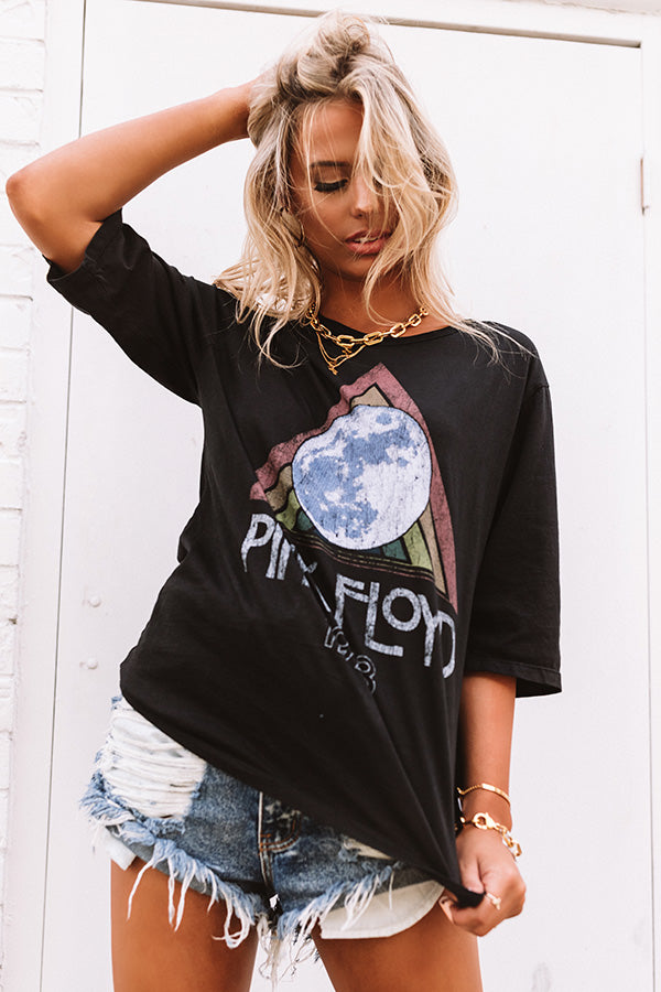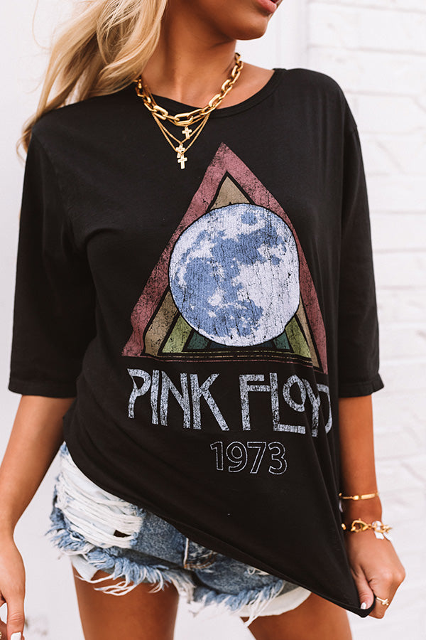 Rock out to Pink Floyd's "The Dark Side of the Moon" album in this vintage black distressed tee featuring lightweight material with the 1973 tour graphic, a high rounded neckline, loose 3/4-length sleeves, and a relaxed oversize fit that falls into a straight hemline! Style with your fave distressed denim, sunnies, and trendy sneakers for a chic grunge look that is perfect for any casual occasion! Measurements