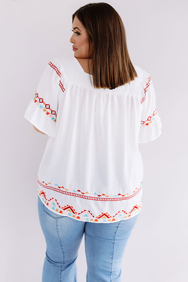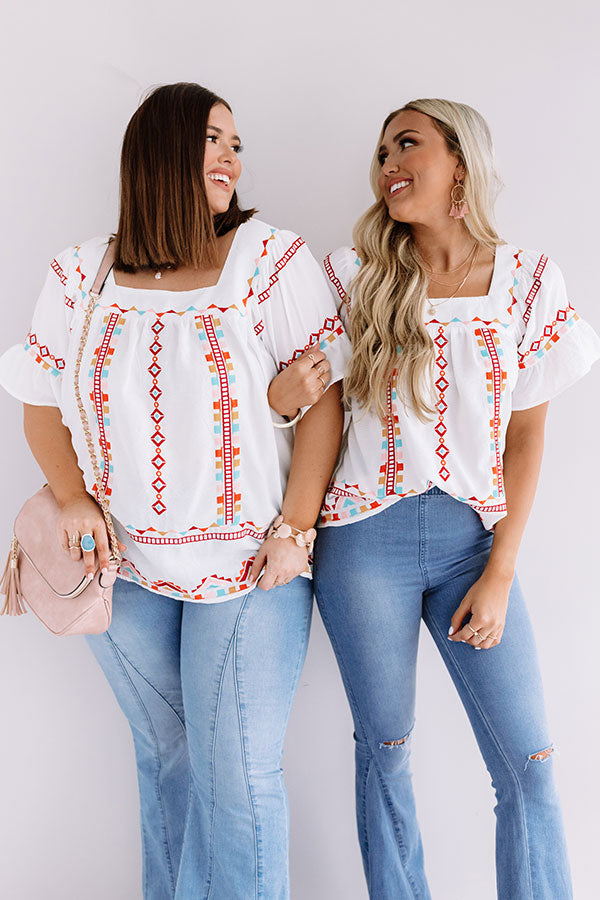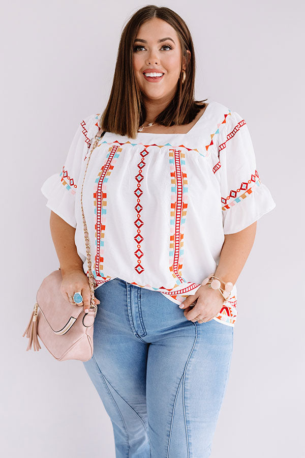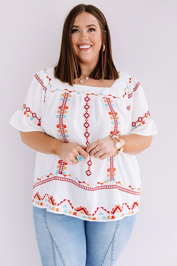Plus Size - Life's a party, so dress like it in our charming white "Pink Sand Beaches" top featuring lightweight material with intricate and colorful embroidered detailing throughout, a square neckline and upper back, short loose sleeves with oversized ruffle trim, and a relaxed silhouette that falls into a rounded hemline! We have styled this festive piece with some light wash flares, brown block heels, and a blush faux leather crossbody, but you can also wear it with some distressed black shorts, "The Lyla Sandal in Red," and our "Tropic Occasion Hat!" Measurements