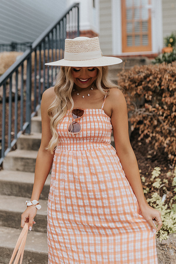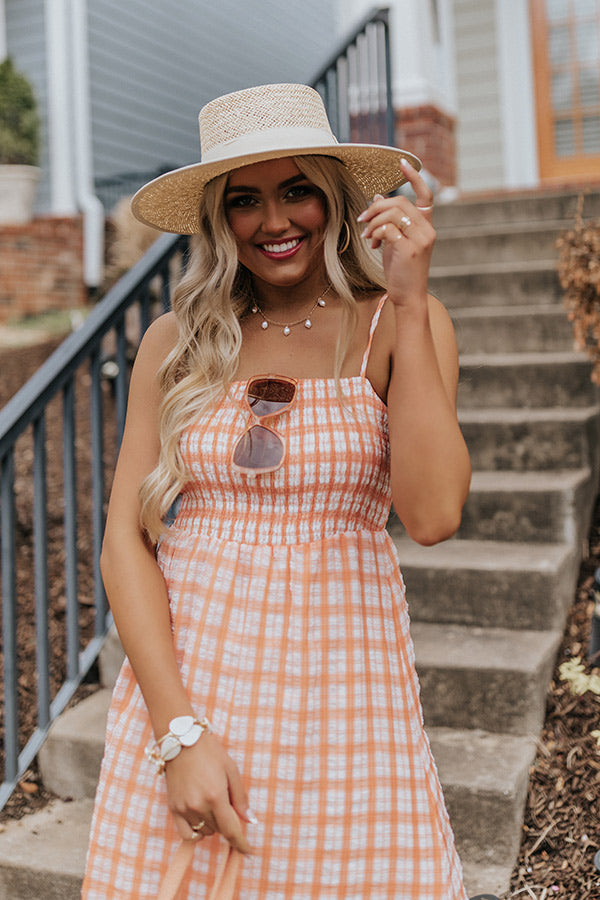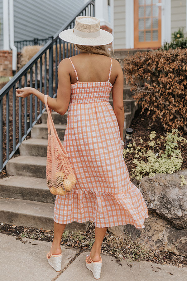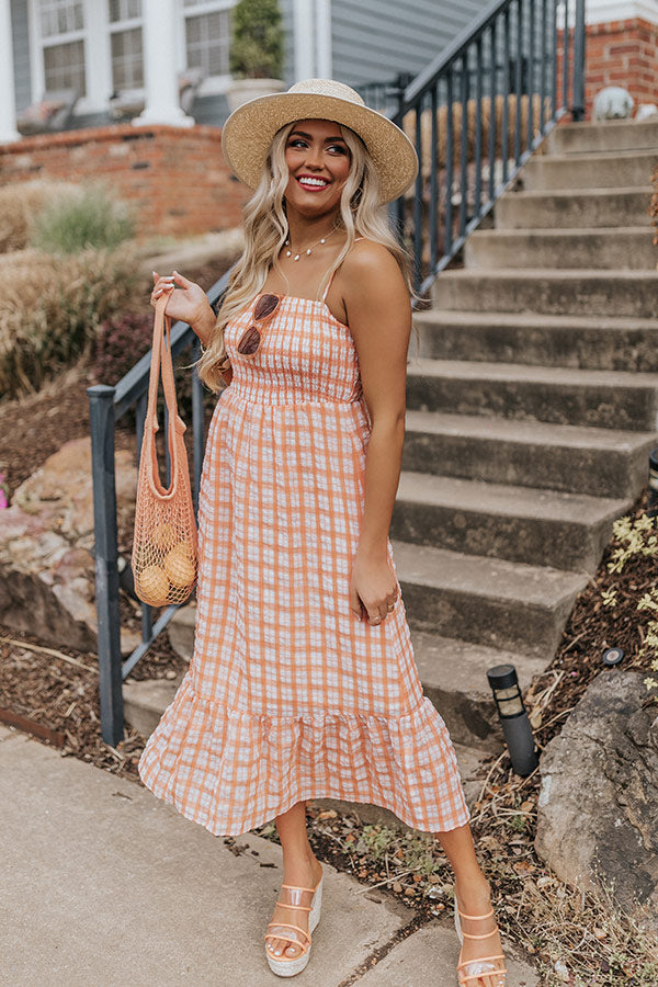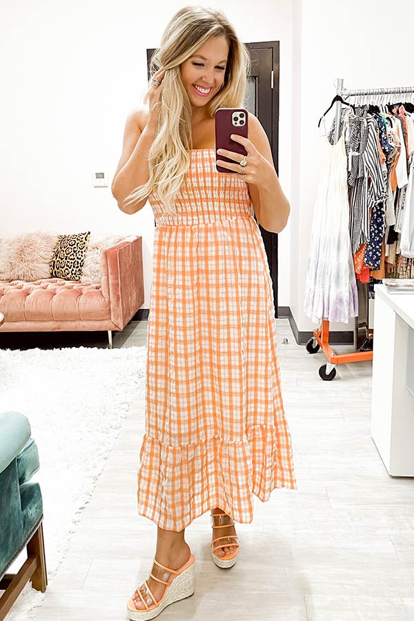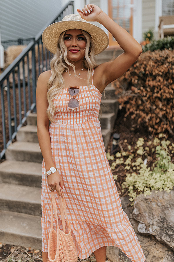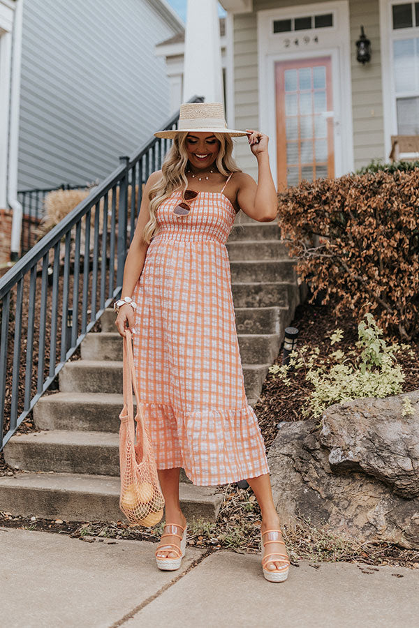 Compliments are sure to fly your way when you wear our stunning 'Pink Sand Shorelines' midi dress featuring lightweight flowy material with seersucker texturing and patterned with a peach checkered print, a square neckline and upper back with adjustable spaghetti straps, and a flattering form fitting bodice that falls into a flowy skirt, and an oversized peplum bottom with a straight mid-calf length hemline! Measurements