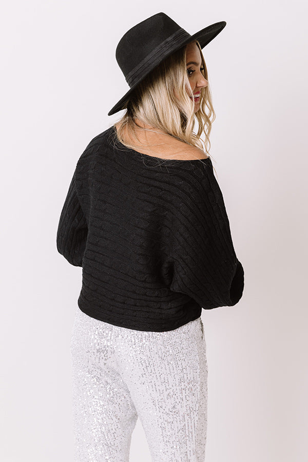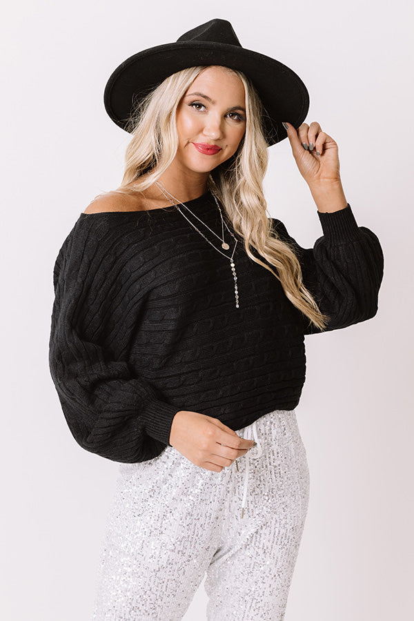 This adorable black sweater is sure to be the pinnacle of your fall wardrobe with its soft lightweight material, horizontal ribbed and twisted knit texturing, wide rounded neckline, long bat wing bubble sleeves with fitted cuffs, and flattering silhouette that ends in a straight hemline!