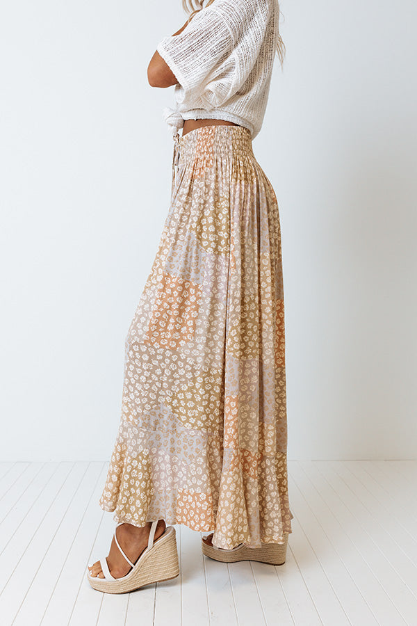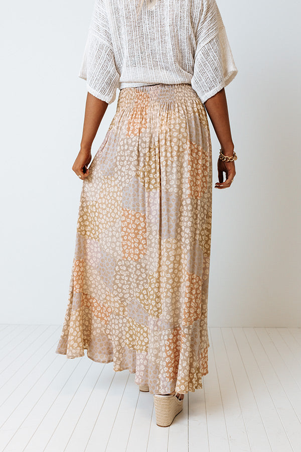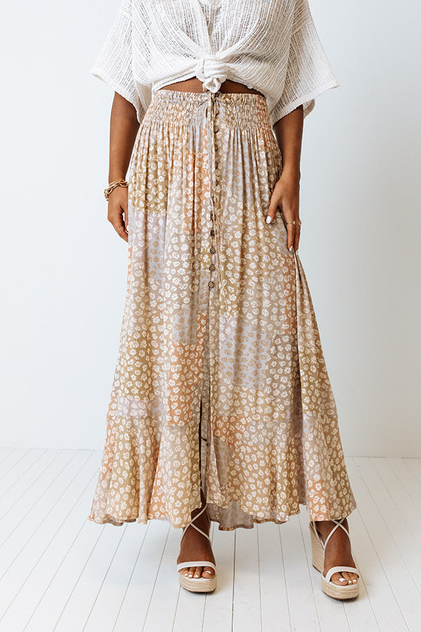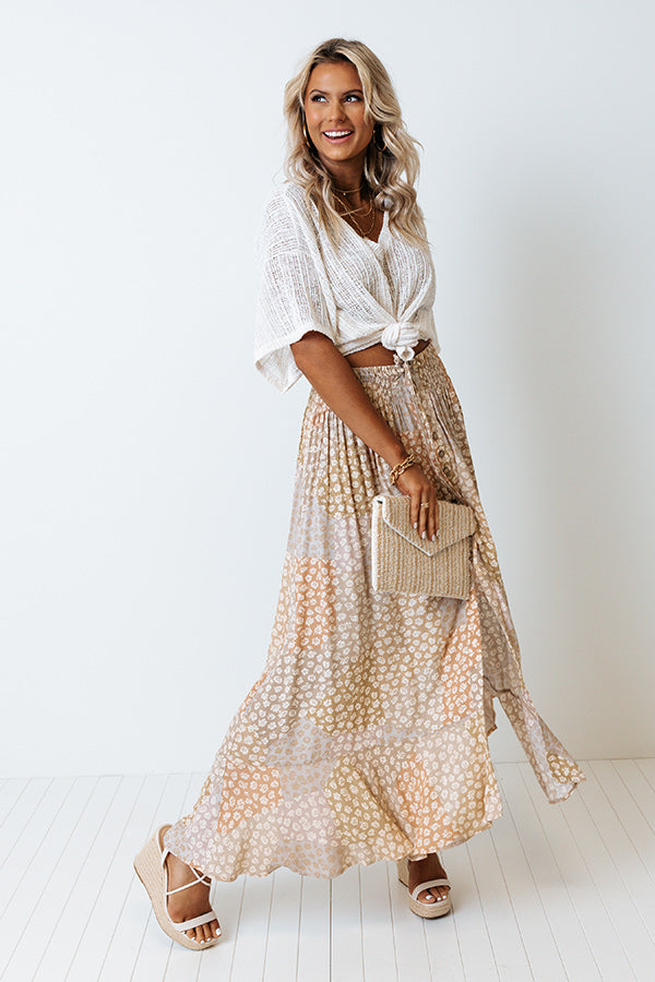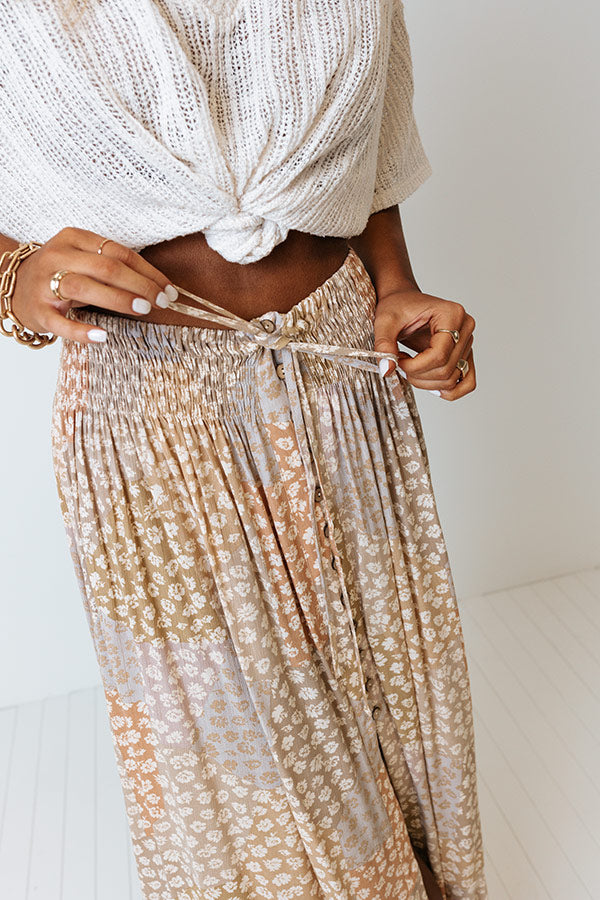 Take your street style game up a notch with our trendy neutral hued 'Pinot And Patios' skirt featuring lightweight breezy material patterned with a small white floral print, a button down front with a tie closure waistline, and a relaxed silhouette that cascades into an uneven mid-calf length hemline! on products
