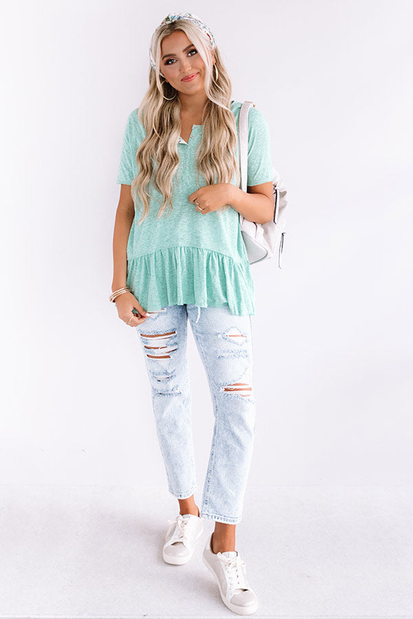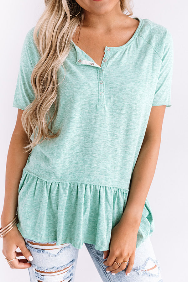 Enjoy "Pinot on the patio" in style with this casual cute green shift top featuring soft lightweight material, a button up bodice with a scooped neckline, short loose sleeves, and a relaxed silhouette that falls into a peplum bottom with an uneven hemline! This upscale basic pairs perfectly with some distressed light wash skinnies, a matching headband, and a trendy sneaker and backpack, but you can also wear it with some frayed white shorts and "The Allen Wedge in Seaglass!" Measurements
