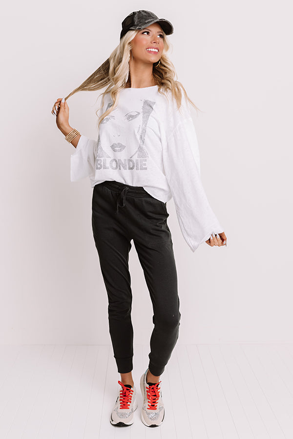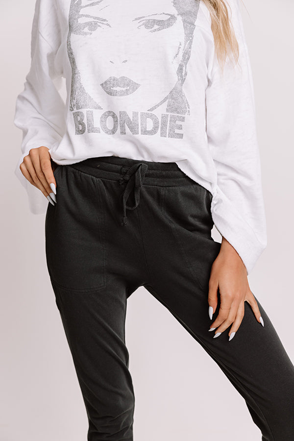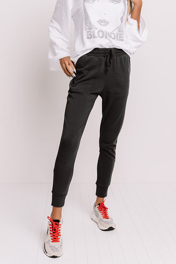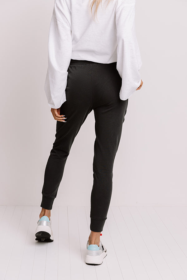 There is no better piece to throw on and go when you have "places to be" than these trendy black joggers featuring soft lightweight material, a wide elastic waistline with a tie belt, accent side pockets, and a figure flattering pants silhouette that falls into fitted ankle-length hemlines! Measurements