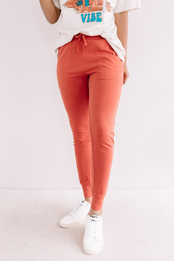 There is no better piece to throw on and go when you have "places to be" than these trendy tangerine colored joggers featuring soft lightweight material, a wide elastic waistline with a tie belt, accent side pockets, and a figure flattering pants silhouette that falls into fitted ankle-length hemlines!