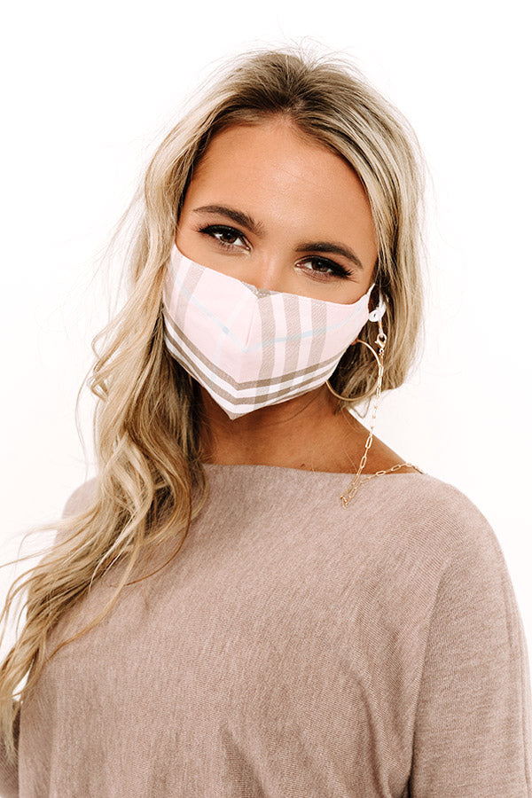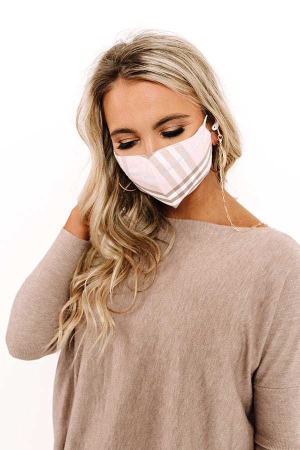 Stay protected in style with our adorable 'Plaid Promises' face mask featuring soft lightweight cloth material patterned with a black, white, light blue, and pink plaid print and two ear straps!