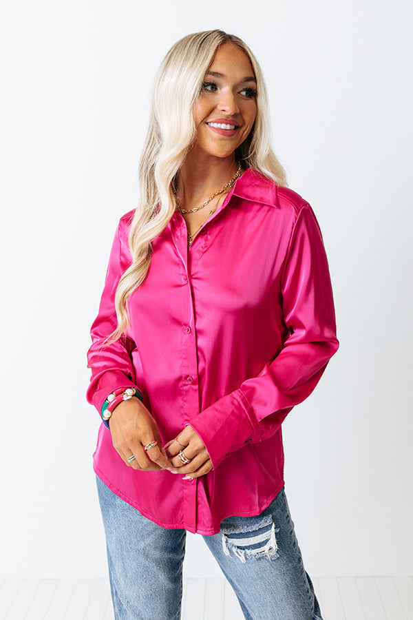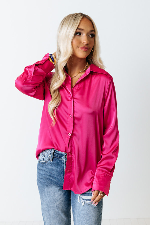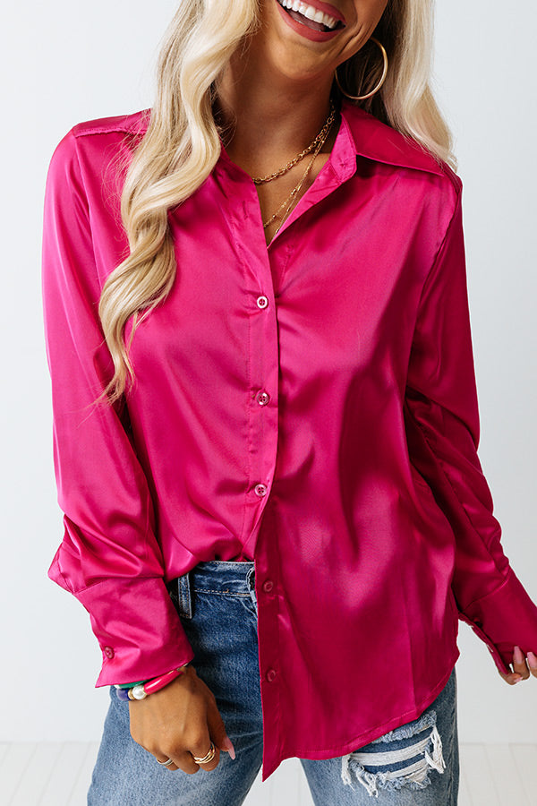 Get dressed for success in this classy fuchsia colored top featuring lightweight satin material, a button up front with a collared neckline, long loose sleeves with button closure cuffs, and a relaxed silhouette that falls into a rounded hemline! on products