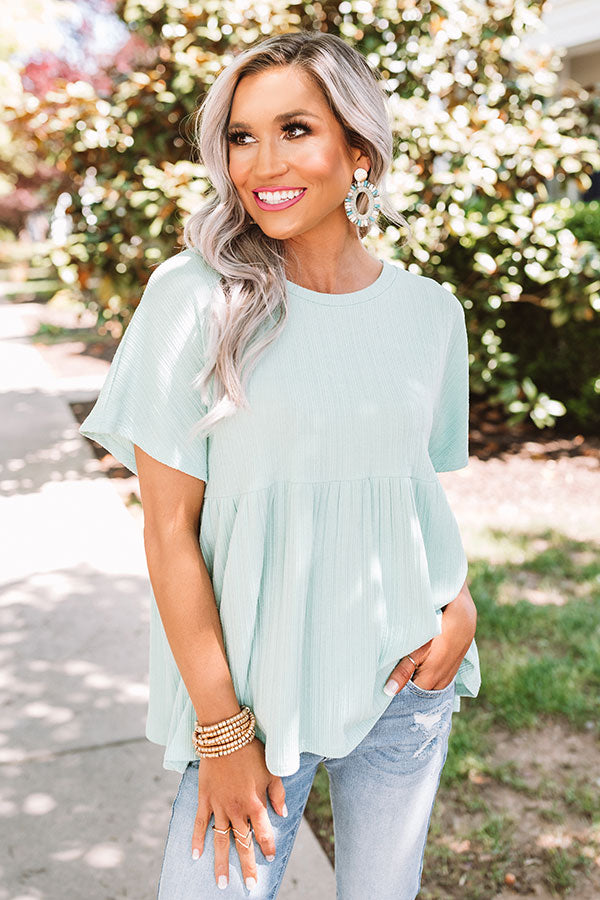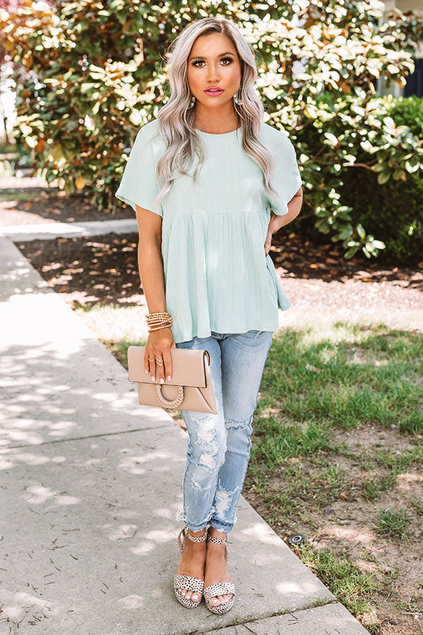 Diversify your wardrobe with our adorable mint colored "Planting Kisses Shift Top" featuring lightweight breezy material with ribbed texturing, a high rounded neckline, short loose sleeves, and a relaxed peplum silhouette that falls into an uneven hemline! Your style options are endless with this cutie! It pairs perfectly with some distressed ankle skinnies, statement earrings, cheetah print heels, and a neutral clutch, but you can also wear it with some frayed white shorts, "The Lela Espadrille in Gold," and our "Style Factor Sunnies in Gold!" Measurements