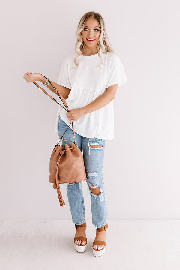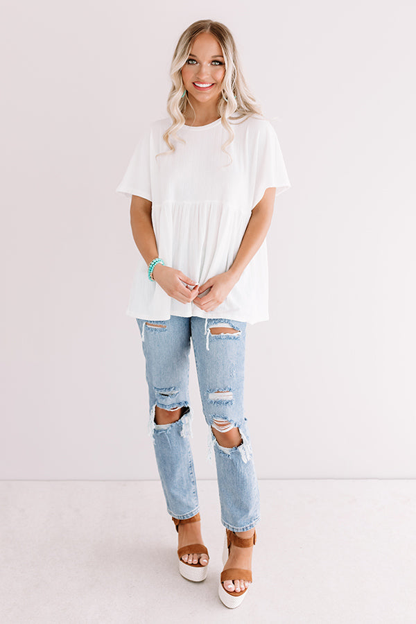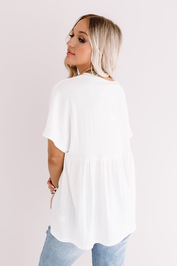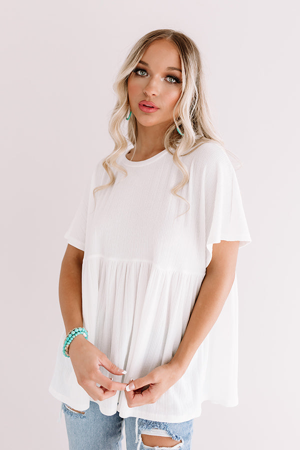 Diversify your wardrobe with our adorable white "Planting Kisses Shift Top" featuring lightweight breezy material with ribbed texturing, a high rounded neckline, short loose sleeves, and a relaxed peplum silhouette that falls into an uneven hemline! Your style options are endless with this cutie! It pairs perfectly with some distressed ankle skinnies and a brown wedge and bucket bag, but you can also wear it with some frayed black shorts, our black and white "Rory Sandal," and our "Flirty And Fashionable Leopard Headband in White!" Measurements