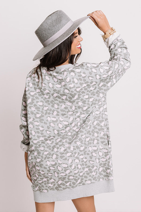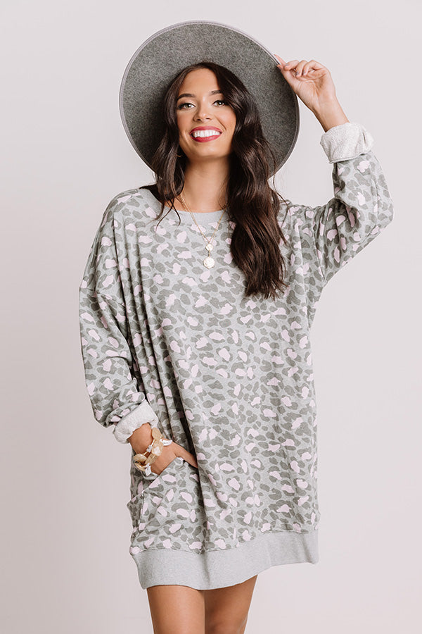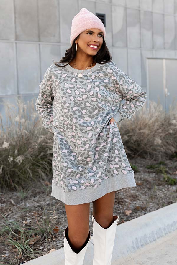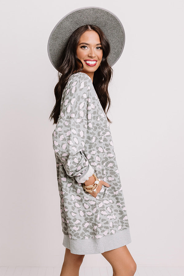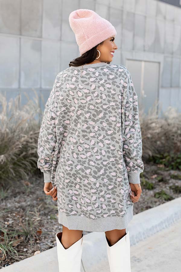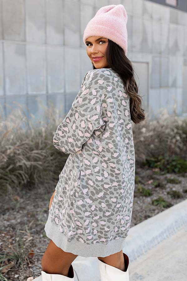"Play it cool" in this casual cute light grey sweater dress featuring soft lightweight material patterned with a light pink and dark grey leopard print, a high rounded neckline, long loose sleeves with fitted cuffs that can be rolled, hidden side pockets, and a relaxed silhouette that falls into a straight and wide mid-thigh length hemline!