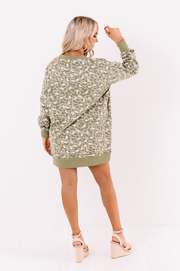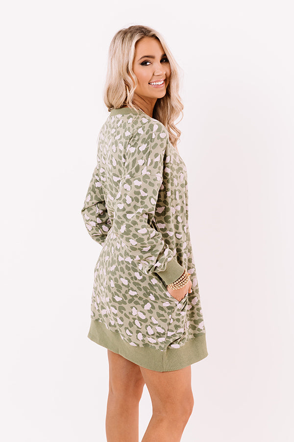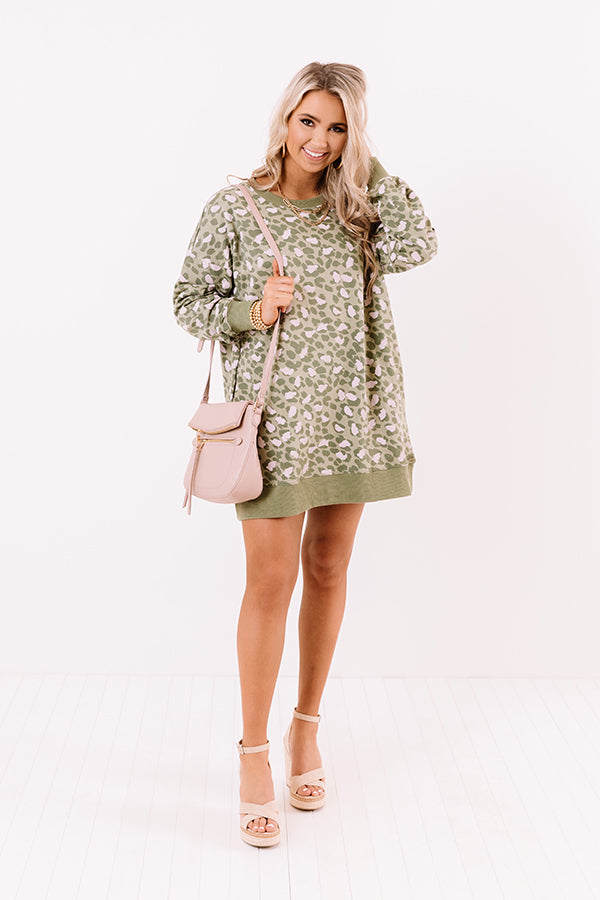 Play it cool in this casual cute sage colored sweater dress featuring soft lightweight material patterned with a light pink and dark grey leopard print, a high rounded neckline, long loose sleeves with fitted cuffs that can be rolled, hidden side pockets, and a relaxed silhouette that falls into a straight and wide mid-thigh length hemline!