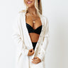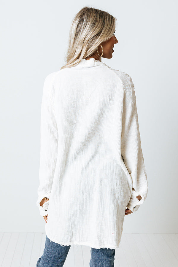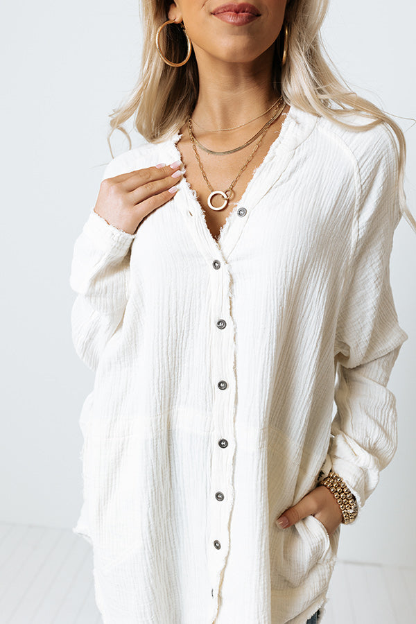 This casual cute ivory colored tunic is sure to be a hit with its lightweight textured material, button up front, long loose sleeves with button closure cuffs, hidden side pockets, and relaxed silhouette that falls into a rounded upper-thigh length hemline!