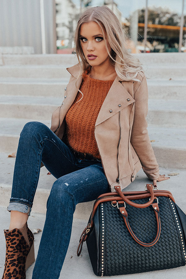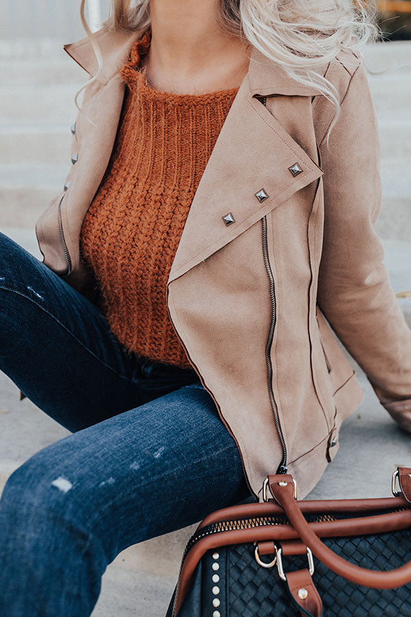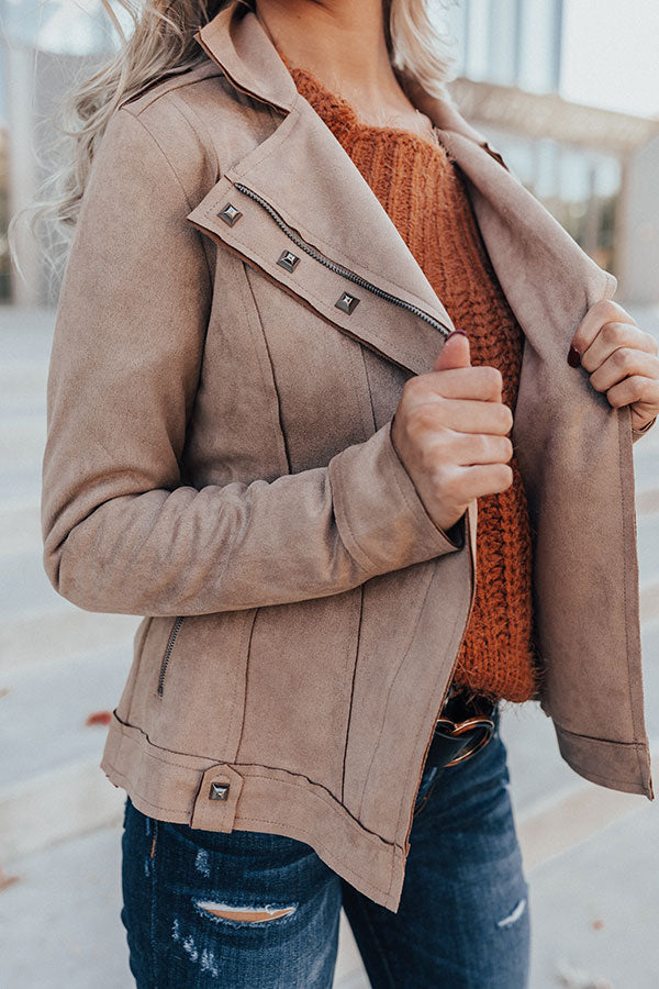 Welcome the chilly weather in style with our neutral hued "Playing For Keeps" jacket featuring soft lightweight faux suede material, long semi-loose sleeves, a collared flap neckline with v-notches, silver studded detailing, shoulder straps, exposed raw cut accent seams, two side pockets, and a form fitting zip-up silhouette that falls into a straight hemline! You can style this versatile piece with just about anything from a basic tank to a sweater, jeans to skirts or dresses, booties to wedges or sandals, clutches to totes, and hats to earrings! Measurements