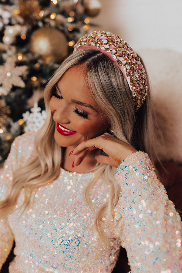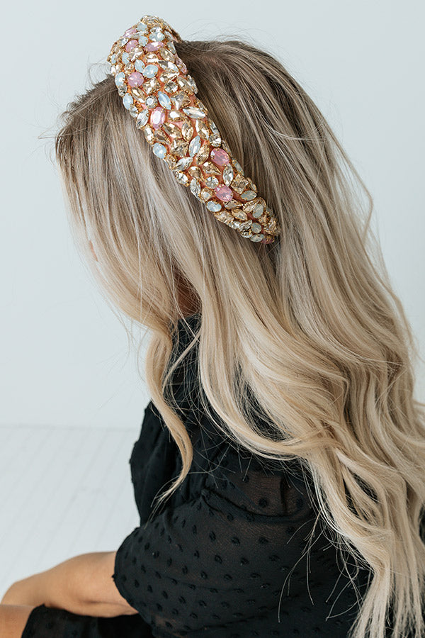 All eyes are sure to be on you in our glamorous 'Plaza Dreams' headband featuring an oversized light pink satin band with shimmering gold, iridescent, and pink gemstone embellishments!