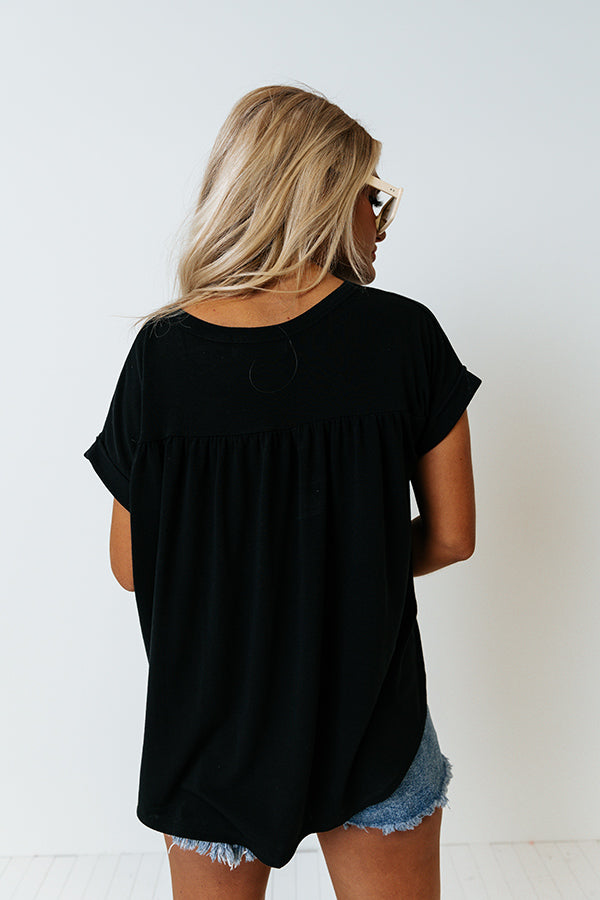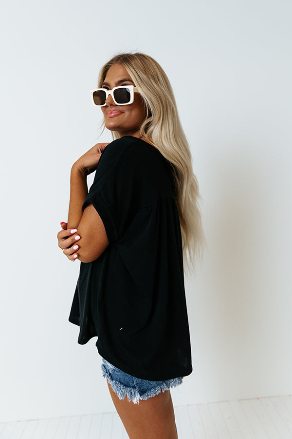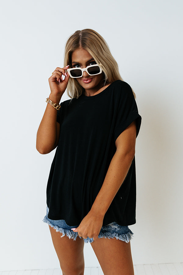 Upgrade your everyday casual look with our simple black 'Plaza Dreams Shift Top' featuring soft and lightweight cotton-blend material, a rounded neckline, short loose sleeves with rolled cuffs, and a slouched silhouette that ends in a straight hemline!