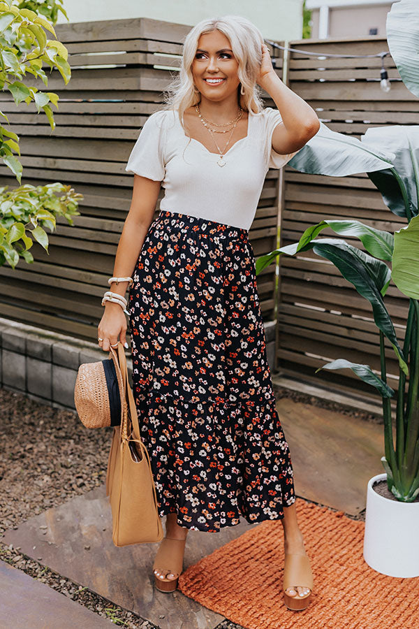 You are guaranteed to look poised and pretty in this adorable black skirt featuring lightweight flowy material patterned with a cute orange/red and mustard hued floral print, an elastic waistline, and a relaxed silhouette that cascades into a straight mid-calf length hemline! Measurements