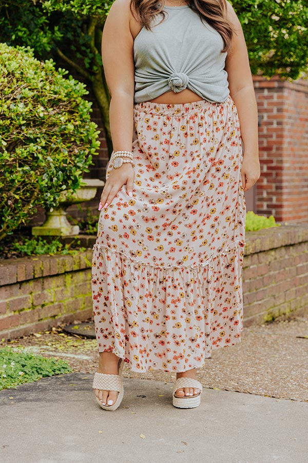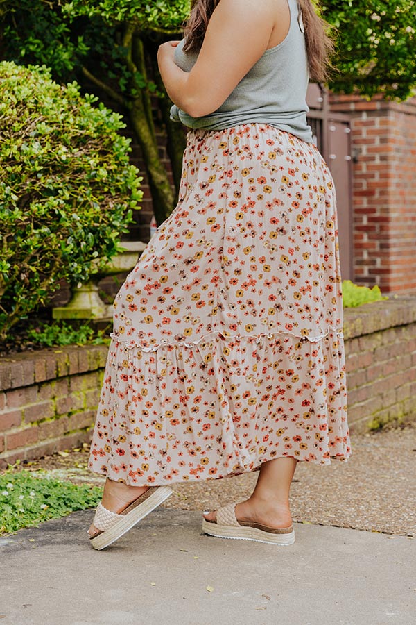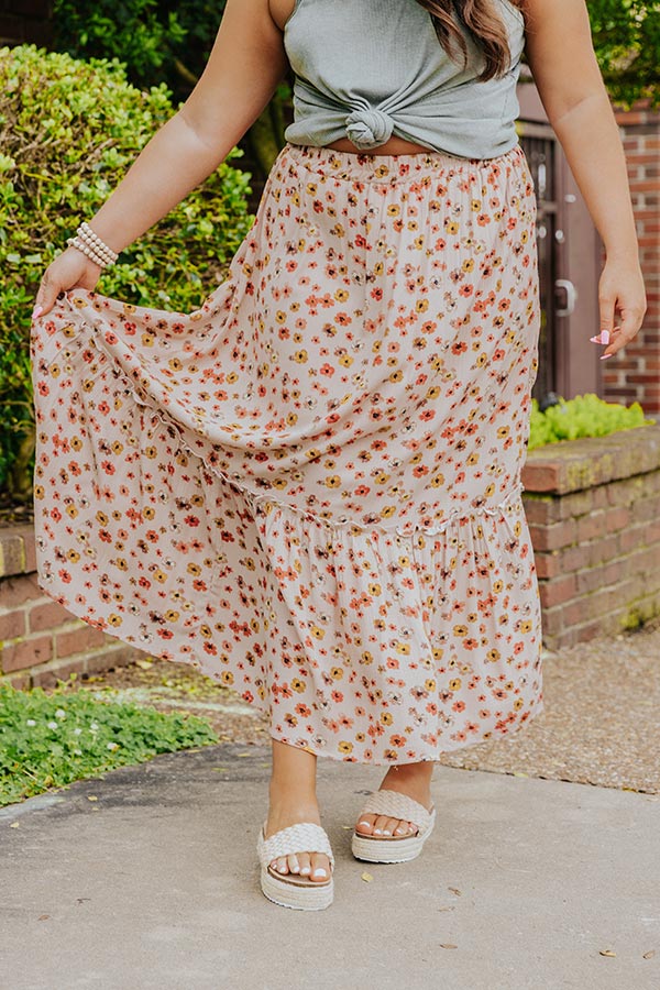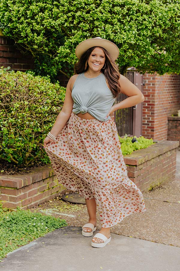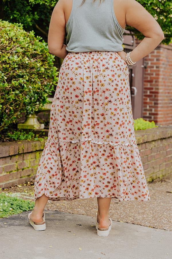Plus Size - You are guaranteed to look poised and pretty in this adorable iced latte colored skirt featuring lightweight flowy material patterned with a cute orange/red and mustard hued floral print, an elastic waistline, and a relaxed silhouette that cascades into a straight mid-calf length hemline! Measurements