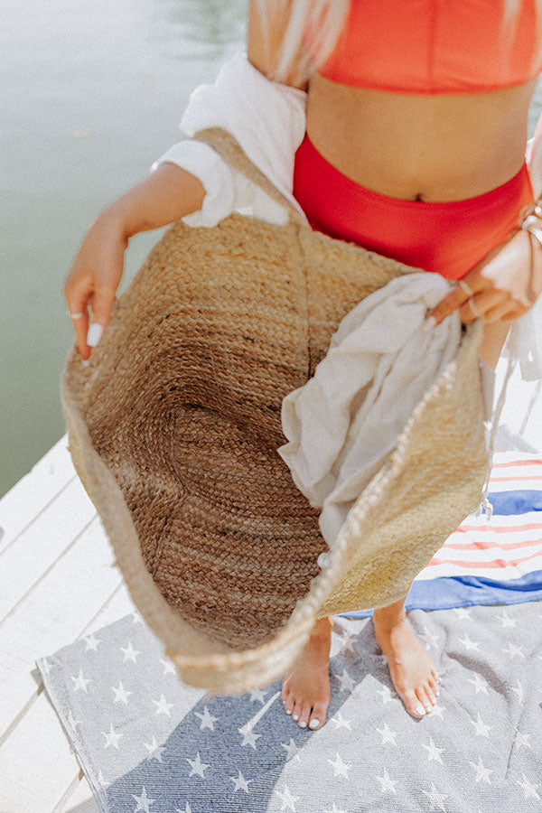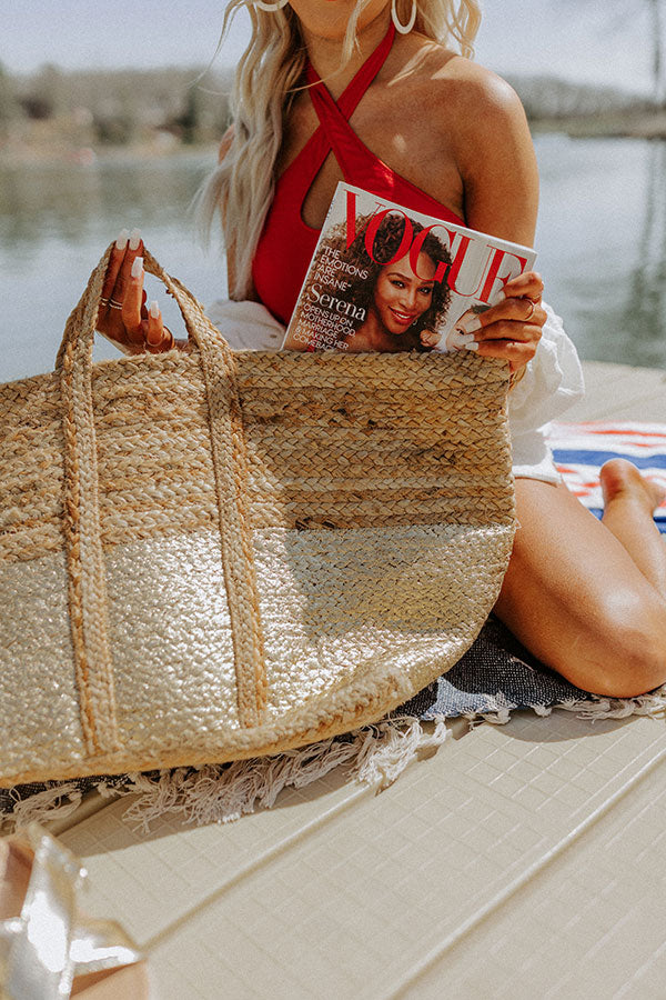 There is no better bag to carry all our waterside essentials in than our practical yet pretty 'Poolside Dip' tote featuring thick woven material with gold detailing, two tote handles, and an oversized spacious interior!