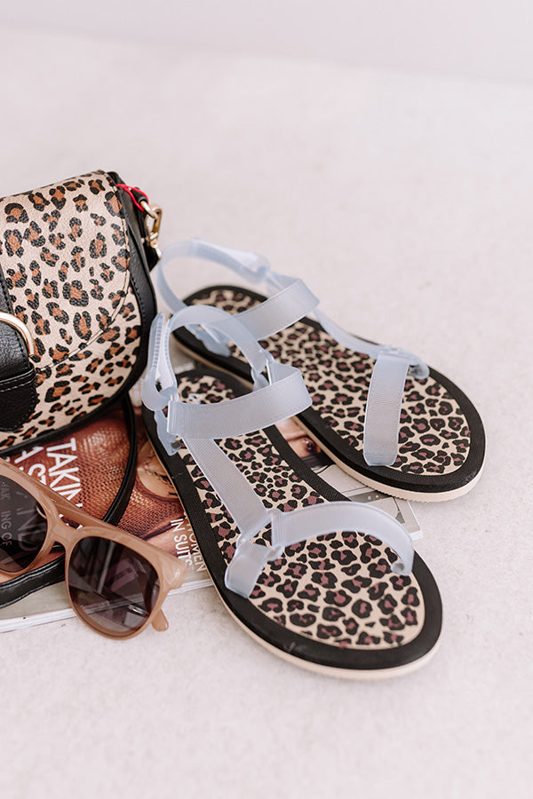 There is no better shoe to wear to a "poolside retreat" than these adorable sandals featuring clear 1-inch over-the-foot straps and velcro closure ankle straps with triangle accents, rounded open toes, and a flat sole silhouette patterned with a black leopard print!
