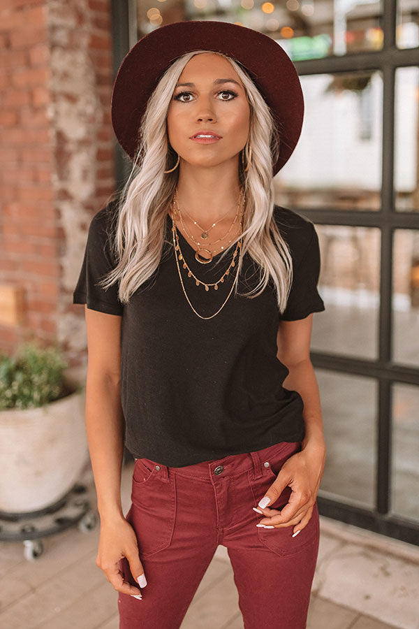 You will be anything but basic in this black shift tee featuring short sleeves, a wide v-neck that an be worn off one shoulder, soft lightweight material, a loose t-shirt fit bodice, and a rounded hemline that can be worn tucked in! We have styled this simple piece with some colored skinnies, a layered necklace, and a faux suede hat, but you can also pair it with a pair of distressed denim shorts, "The Karlie Perforated Bootie in Black," and our "Florals Forever" hair scarf in black for a variety of looks that will take your from poolside popsicles to the pumpkin patch! Measurements